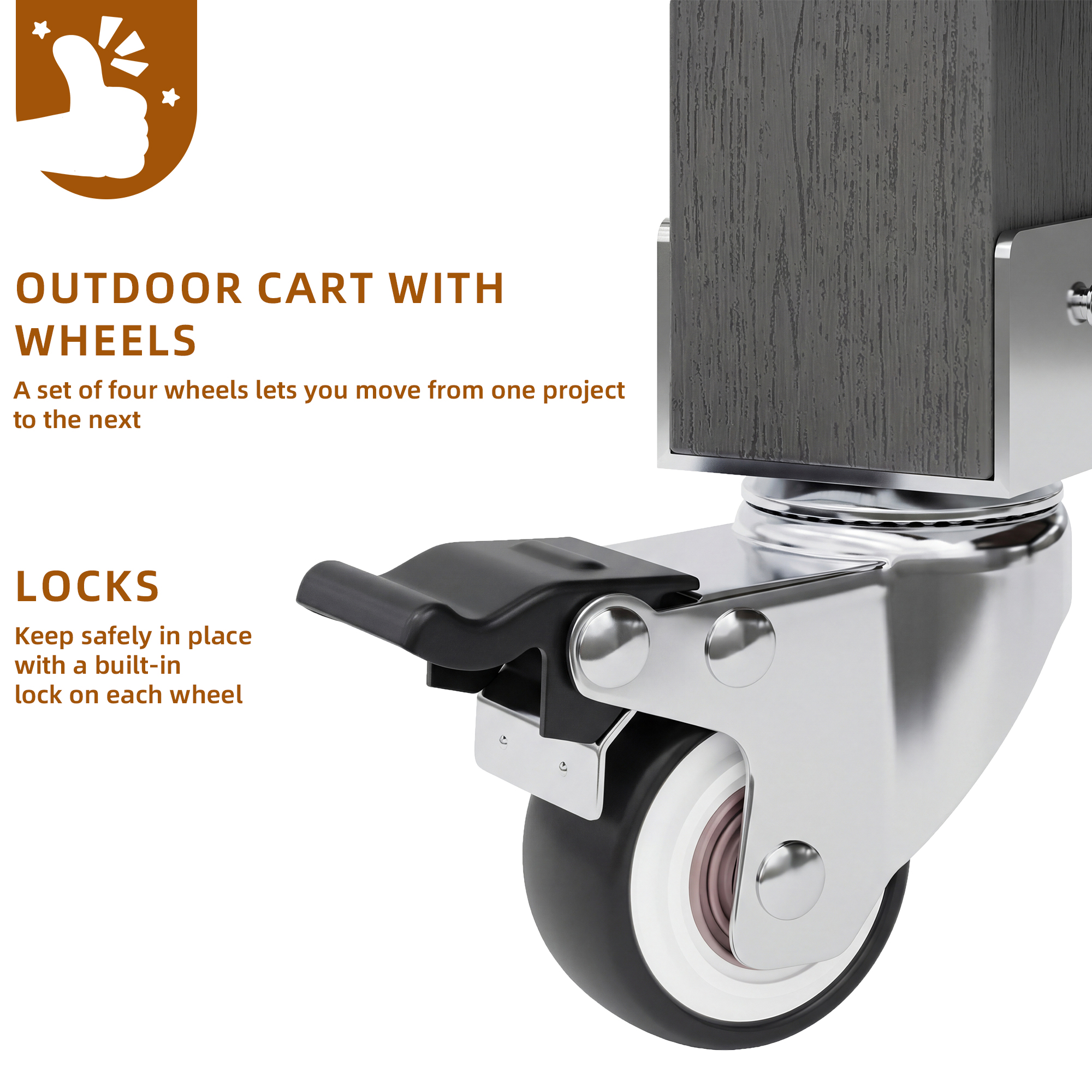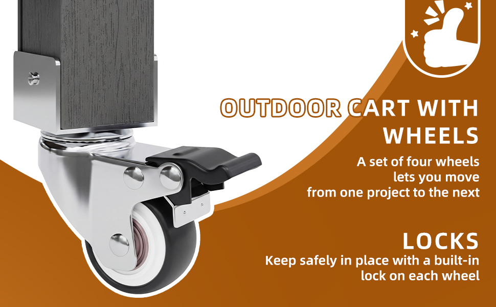 Four high-quality casters, two of which are lockable, allow for easy transport and secure positioning. Whether used as an outdoor tool cabinet, grill station, or serving cart, it can be moved effortlessly and locked in place. The integrated brakes ensure stability on various surfaces and increase safety during daily use.