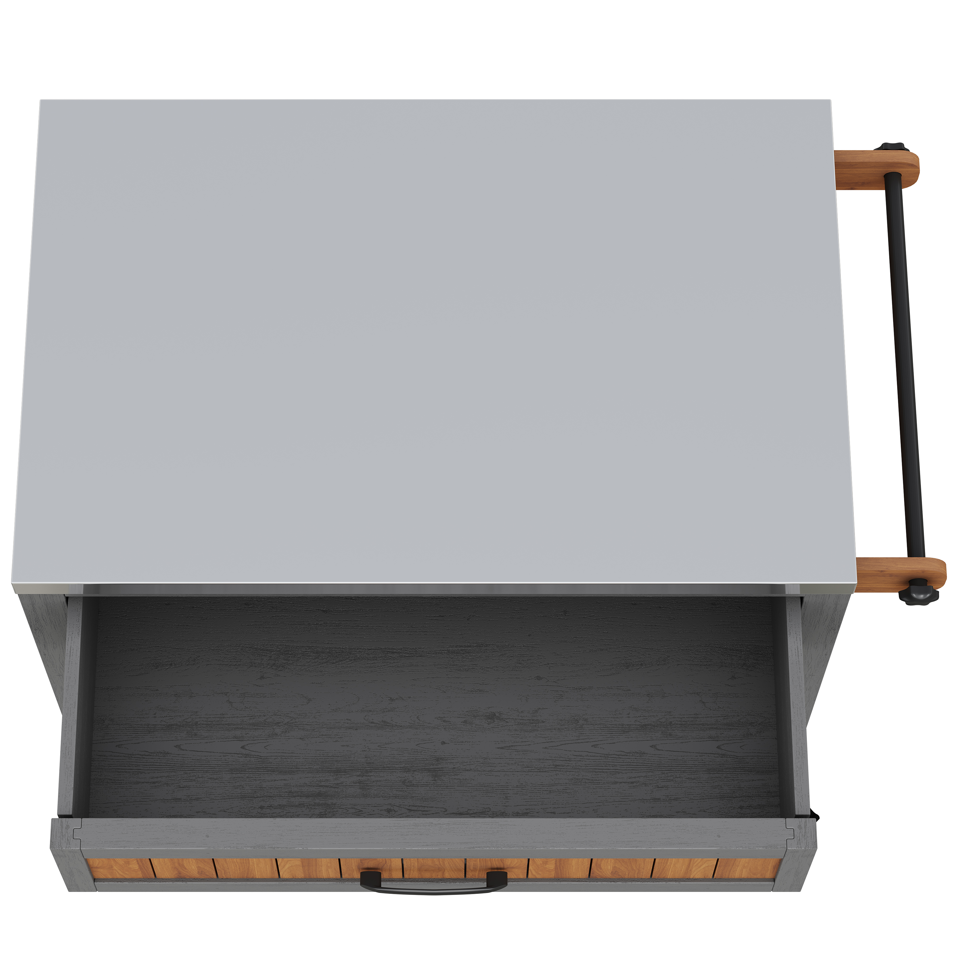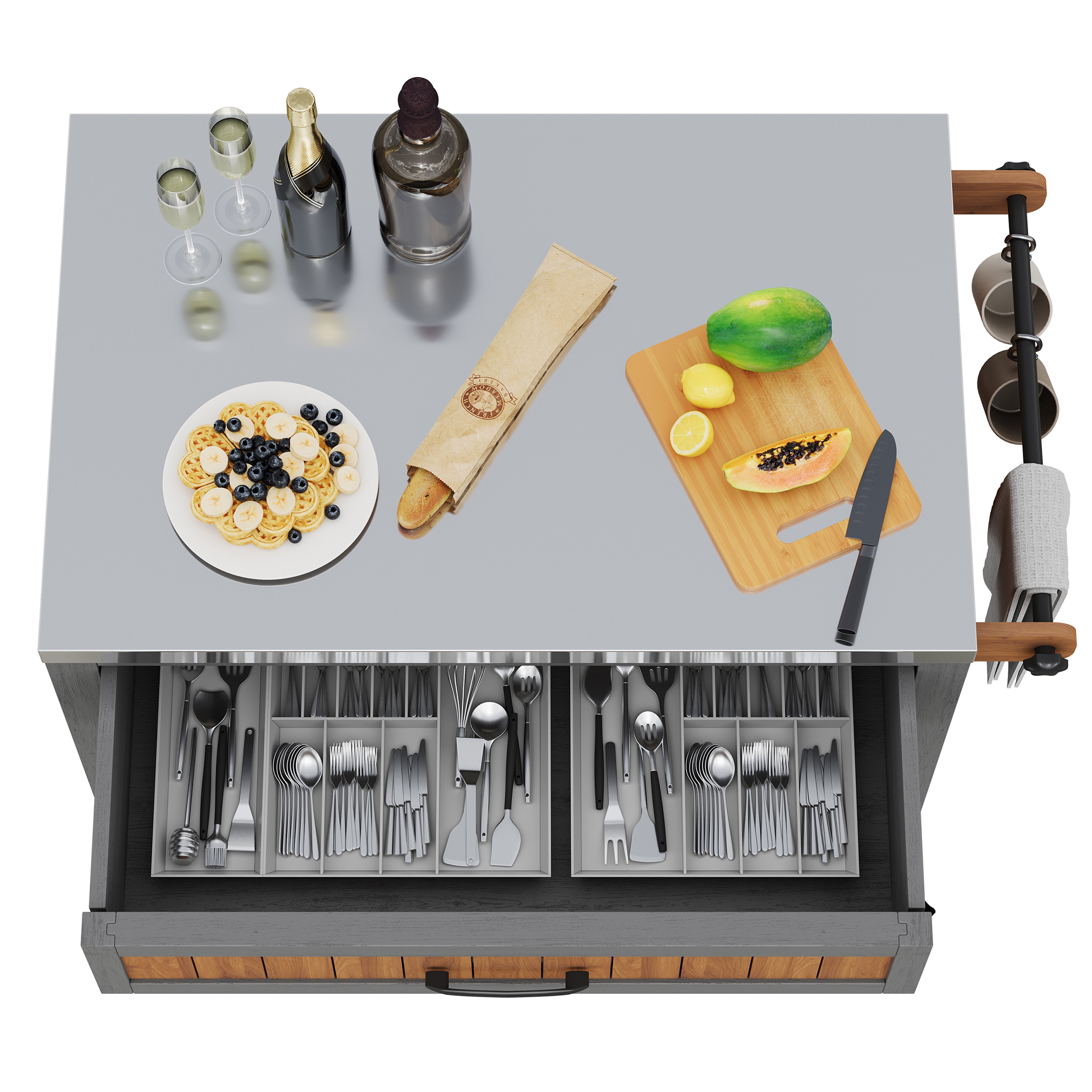 The cabinet impresses with thoughtful details such as a towel rack, a large drawer, and a double-tiered shelf. Everything has its place – from grilling accessories and garden tools to dishes. The generous stainless steel worktop is easy to clean, robust, and perfect as a preparation surface or for creative outdoor work.