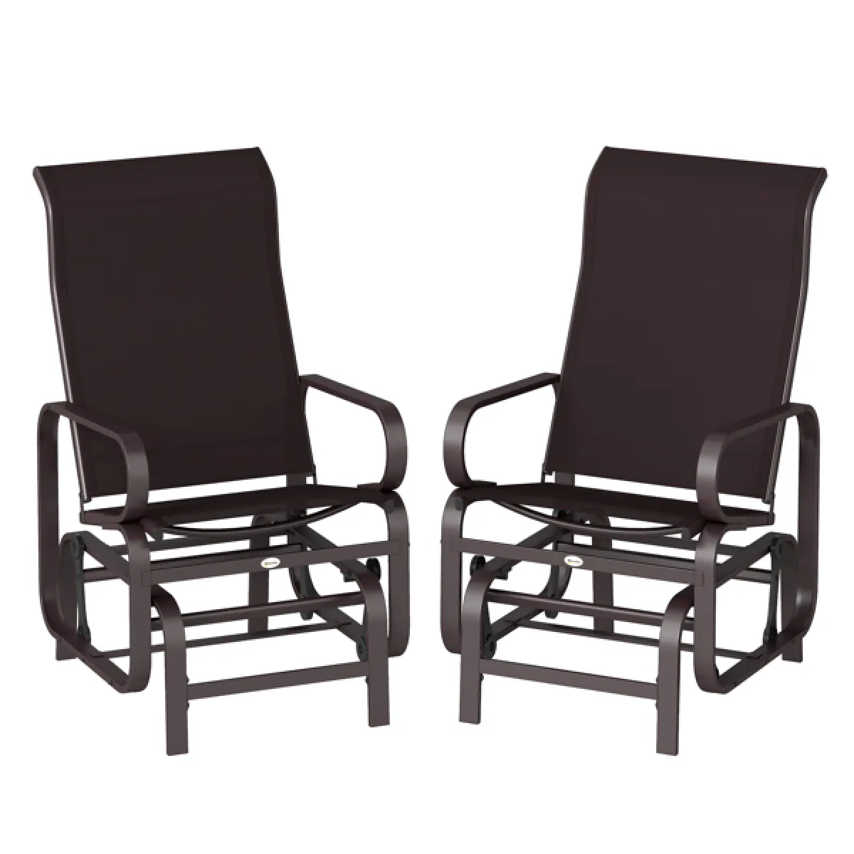 Features: - Two patio gliders offering a classic function mixed with modern design - 28-inch high back with ergonomic head support - Weather-resistant mesh fabric and powder-coated steel combine for lasting appeal - Smooth, quiet and cozy glider mechanism - Great for outdoor spaces like backyards, patios, gardens, and porches - Assembly required Specification: - Color: Brown Frame, Brown Fabric - Materials: Metal, Breathable Mesh - Overall Dimensions: 23.5" W x 30.75" D x 41.25" H - Seat to Floor: 17.25 H - Seat Dimensions: 19.75" W x 16.75" D - Net Weight: 46 lbs. - Max. Load: 352 lbs.