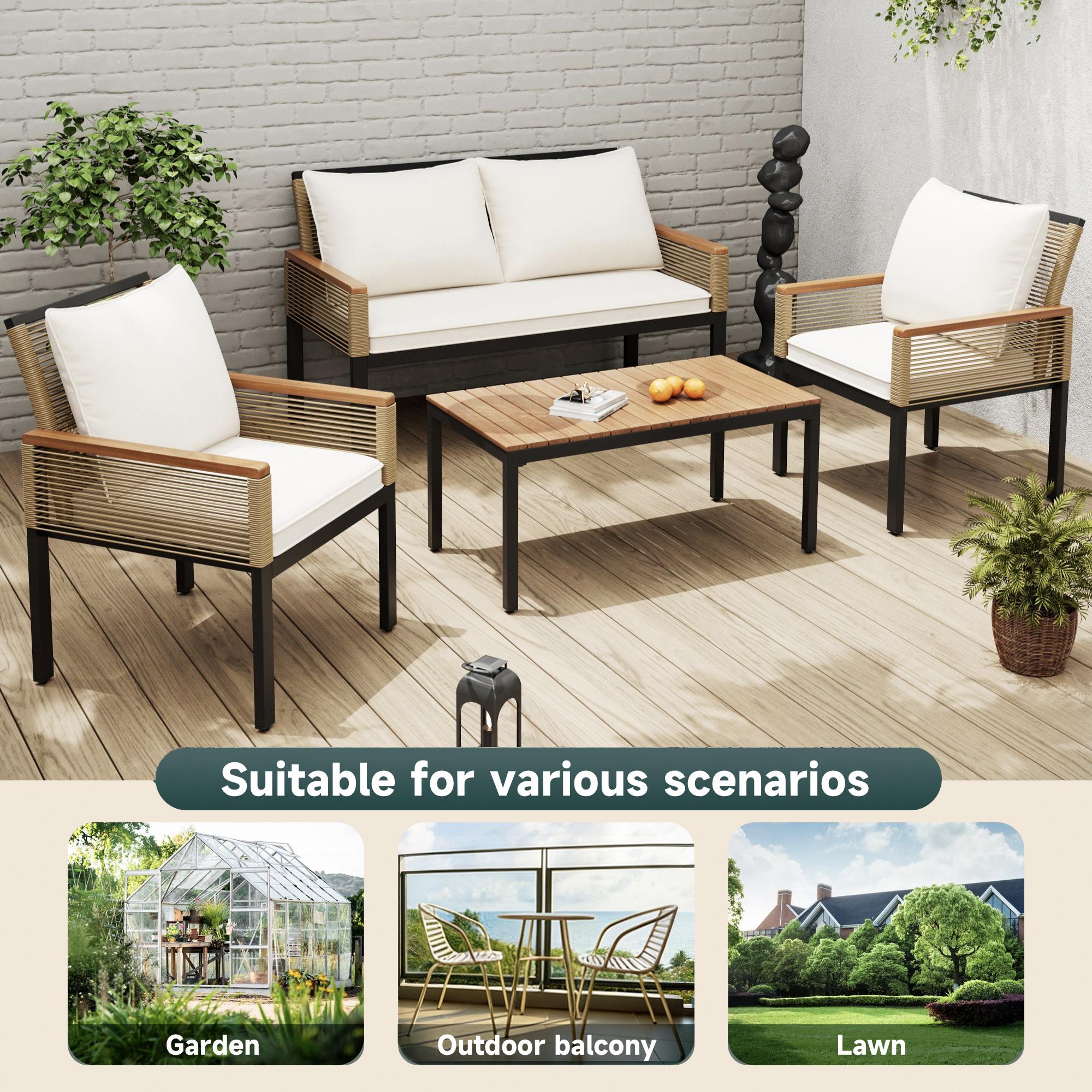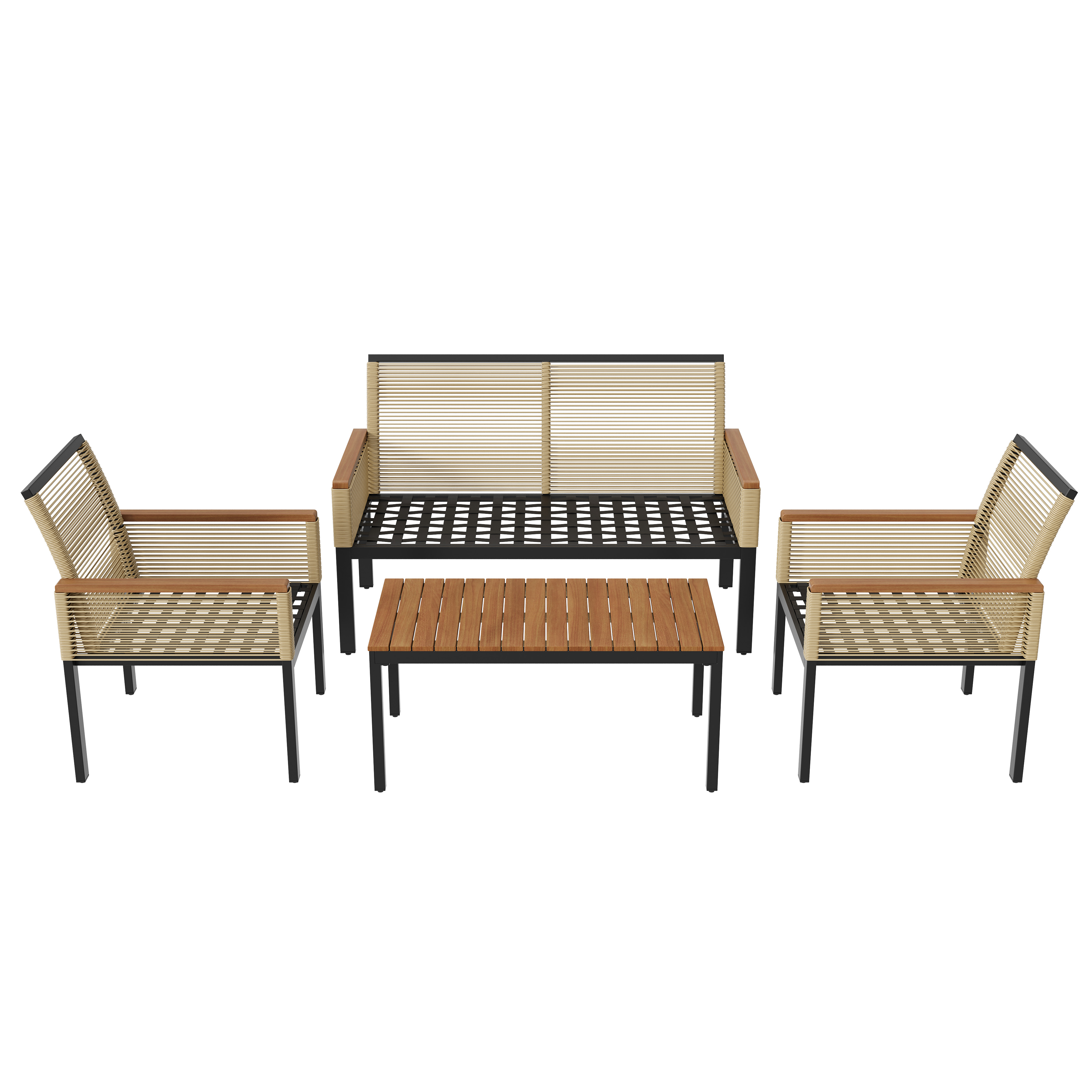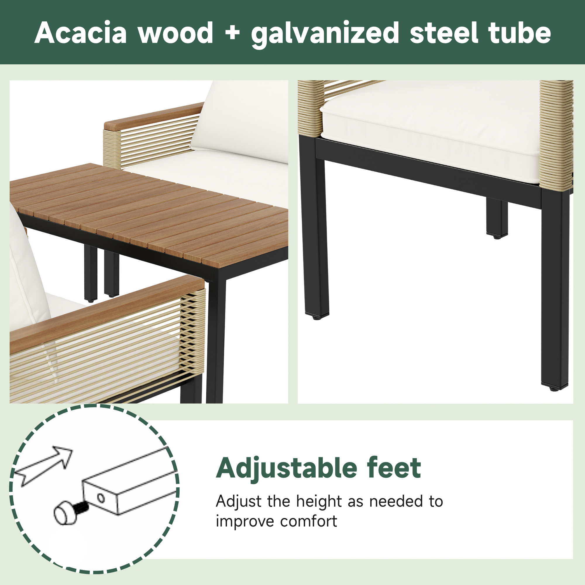 | Material | Galvanized steel tube, anti-rust plastic spray, UV protection material & poly rattan, sponge and acacia. |