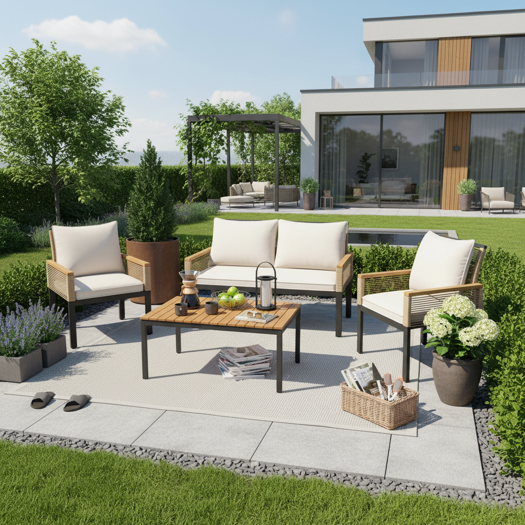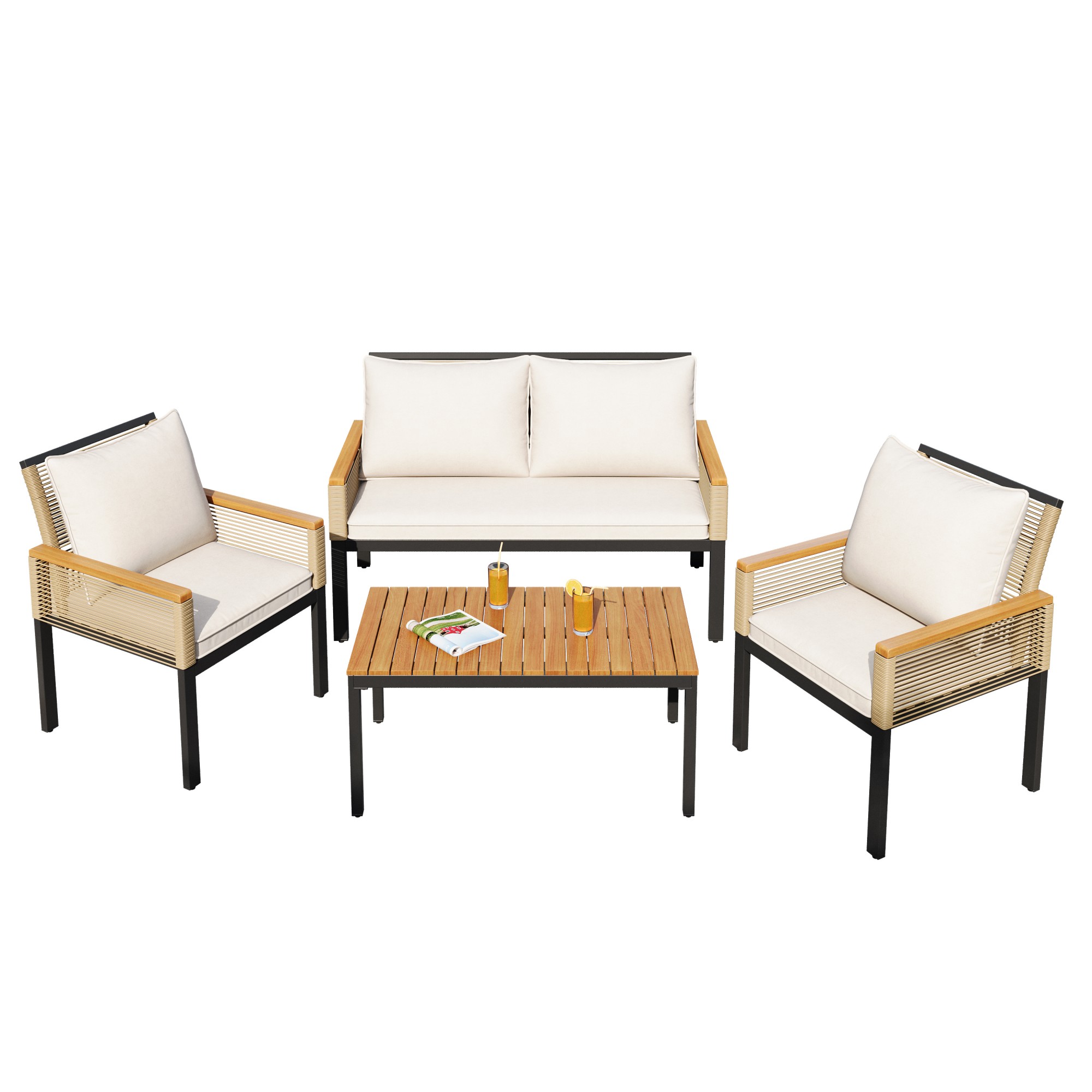 Product Name:Garden lounge set, garden furniture set with comfortable cushions, double sofa, 2 armchairs and table, outdoor, rattan, table and chairs, Beige