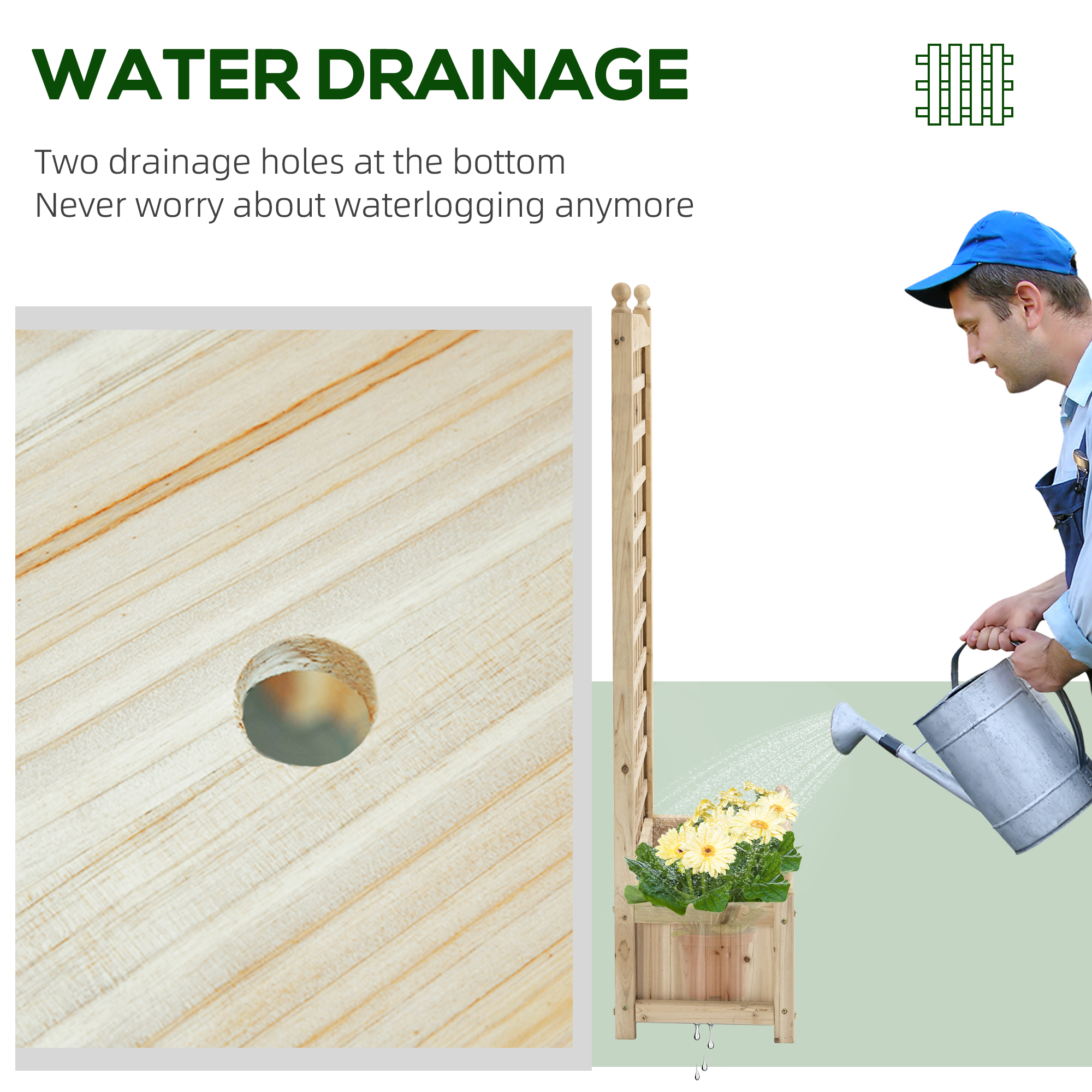 A two-in-one design, in its most simple form. Merging together a planting box and back trellis, you can grow climbing plants, flowers, vegetables and more together. Made from wood, the structure is strong; left in it natural form you can leave how it is or decorate how you want. Outdoor planter is complete with two leakage holes to prevent water build-up.