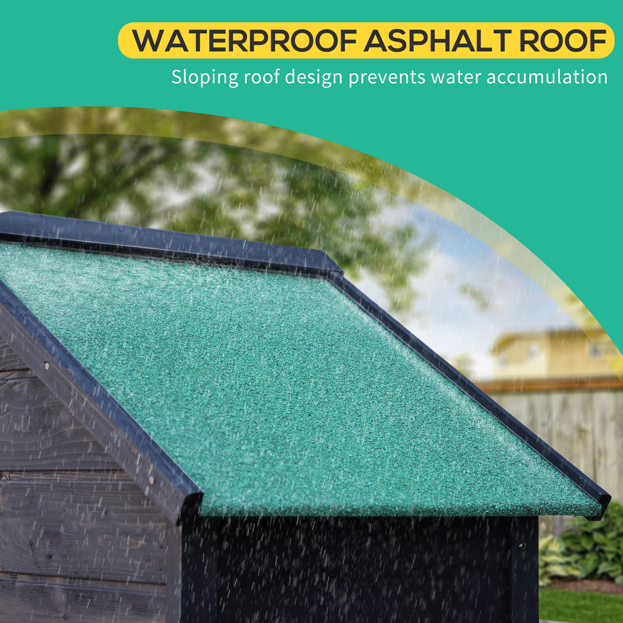 This shed comes in a tall, slightly narrow design: a great storage piece for small garden and outdoor spaces. Inside, on the left, there are three shelves for easy organisation, with an open right side which caters for large and long pieces. Made from fir wood for a durable outdoor structure, it's fitted with a sloped roof, so no water build-up. Ashapt covering on the roof to help prevent water entering inside. Complete with a latch on the two doors for security.