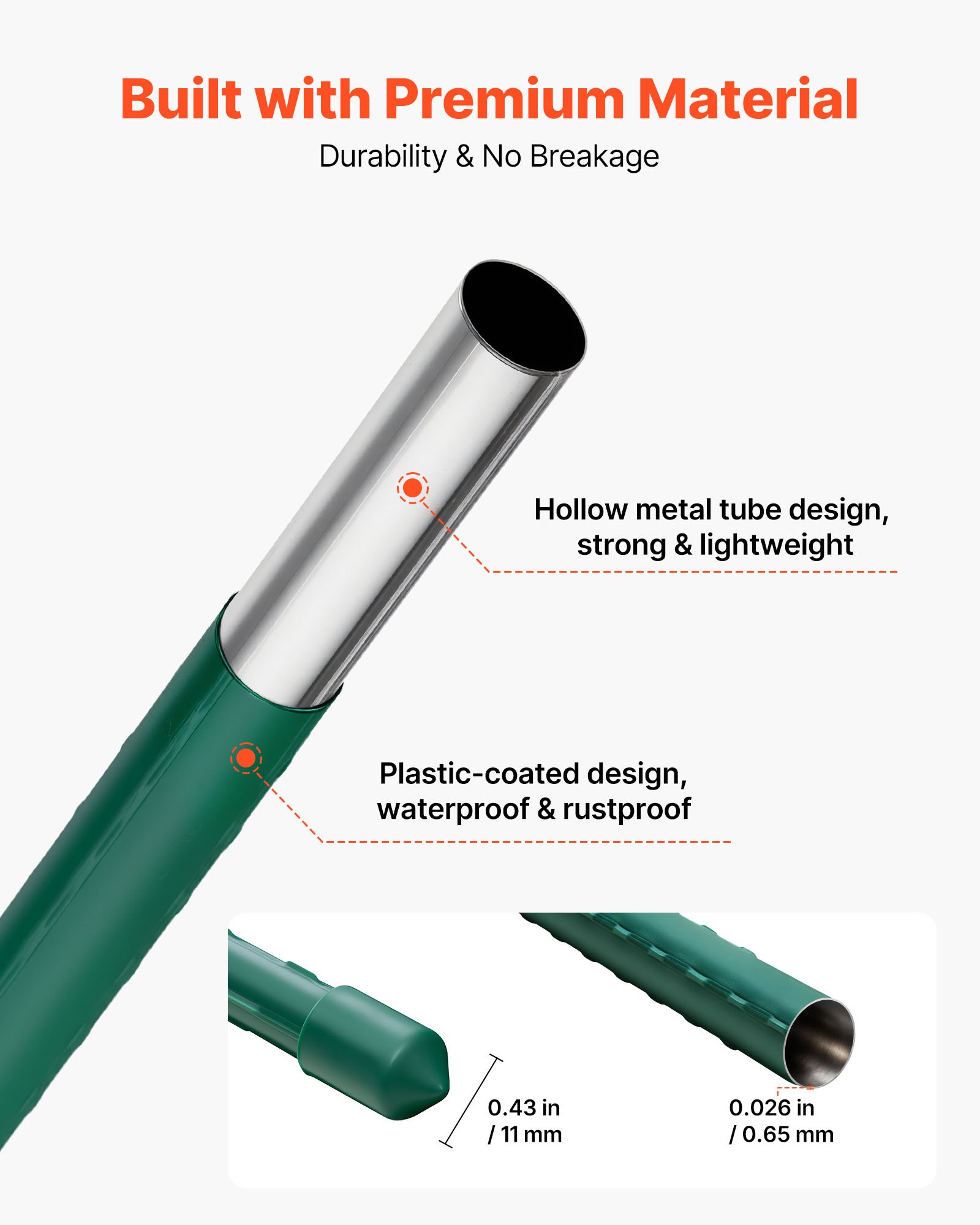 Premium PE-Coated Steel: Made with high-strength PE-coated metal pipes, these tomato stakes deliver durability and compression resistance. The sunlight- and weatherproof PE layer withstands fading, cracking, or deformation for long-lasting outdoor use