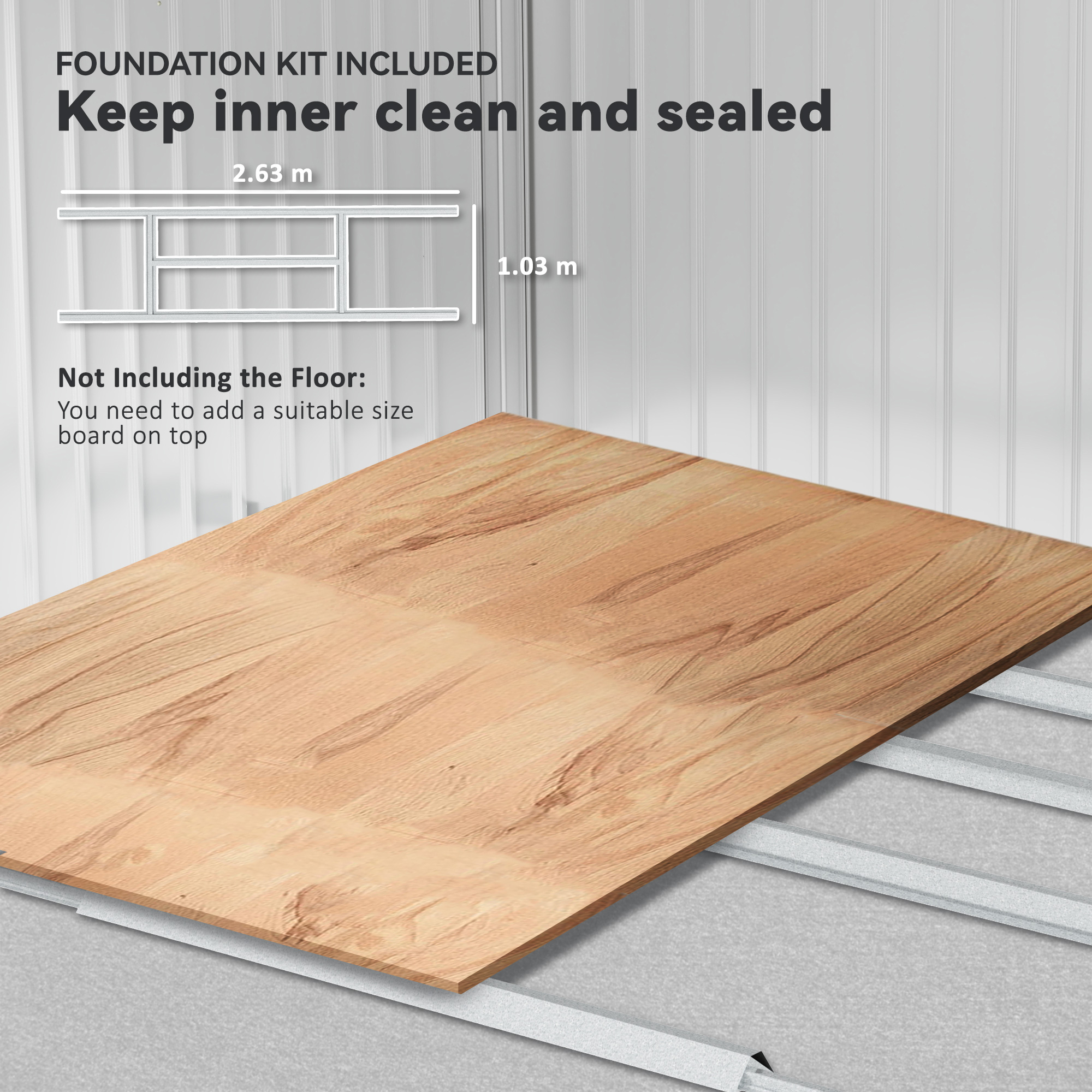 Keep your garden equipment and outdoor essentials locked away securely with this metal shed from . Built from galvanised steel for strength, it comes with a lockable double sliding door on the front for easy access and four vents for air to circulate and prevent moisture buildup. The garden tool shed is finished with a protective weather coating and a foundation kit (FLOOR IS NOT INCLUDED).