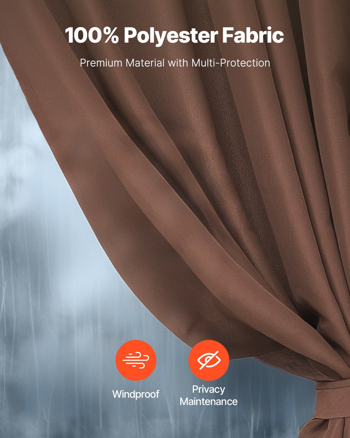 Features & Details Compatible Size: This gazebo replacement curtain is designed for 10' x 10' x 6.9' gazebos. Made from 100% polyester, it offers excellent durability and sun protection. The double-sided zipper allows for easy adjustments from inside or outside, ensuring a quick installation for a comfortable, private outdoor space. Premium Waterproof Fabric: Crafted from 160gsm high-quality waterproof polyester, this outdoor gazebo curtain provides exceptional waterproofing, sun protection, and wind resistance. It safeguards your outdoor area from harsh weather while maintaining your privacy for a comfortable and secure environment. Dual-Sided Zipper Design: The gazebo curtains features dual-sided zipper that allows for effortless opening and closing from both inside and outside the gazebo, offering great convenience for easy access. Aluminum Grommet Design: Featuring aluminum grommets, this gazebo privacy curtain ensures a durable hanging solution and simplifies installation. The grommets securely hold the curtains or decorations in place, whether using hooks or rings. Three-Section Ties: This privacy curtain for gazebo includes a three-section tie design for stable all-around support. It keeps the curtain securely in place at the top, middle, and bottom, preventing slips while effectively protecting your privacy—ideal for indoor and outdoor decor.