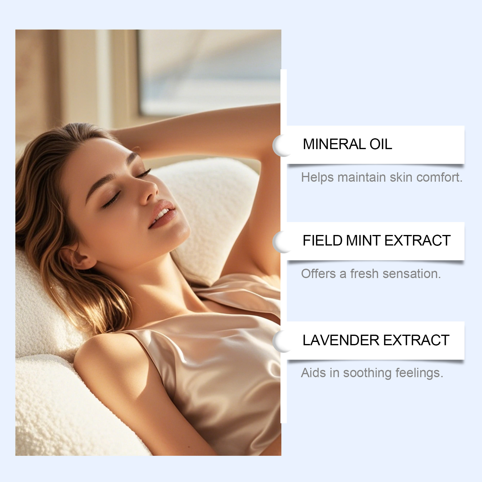Ingredients: Active ingredients: lavender extract and peppermint extract.