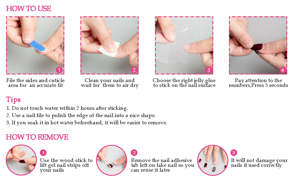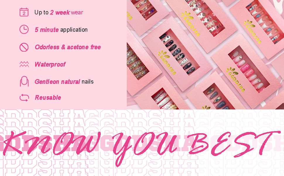 • ~Eco-Friendly Material and Work well~ *Artificial nails are made of high quality acrylic material, durable and not easy to chip and crack. Our press-on nails are made of eco-friendly PMMA acrylic material, non-toxic, odorless and environmentally friendly. *Pmma acrylic press on nails lasts for about 14 days.