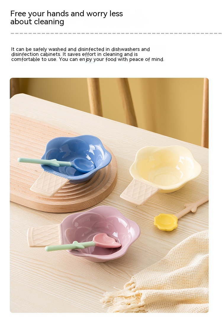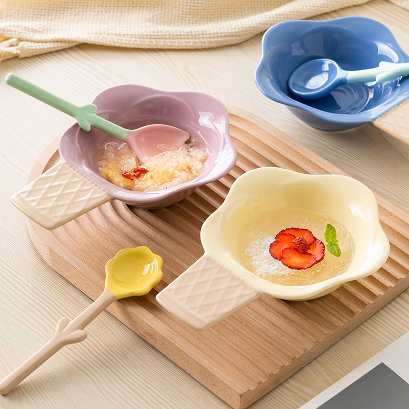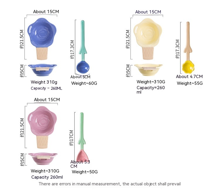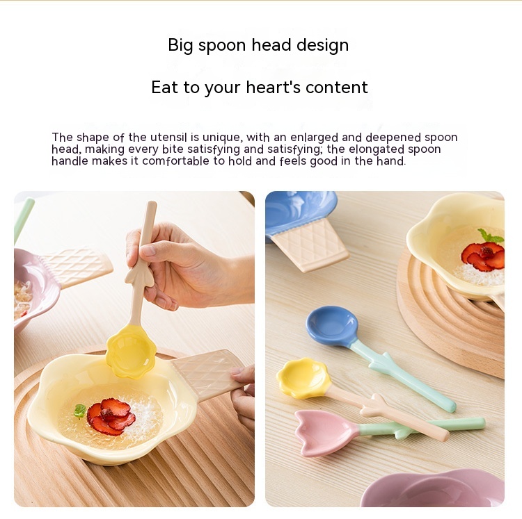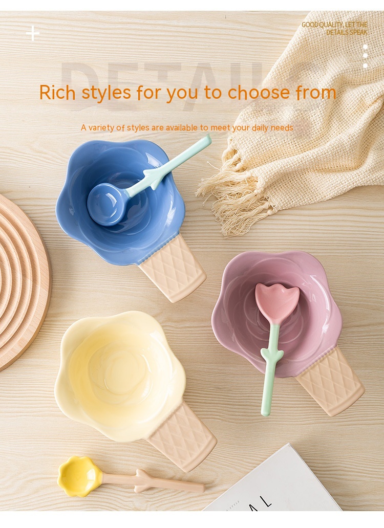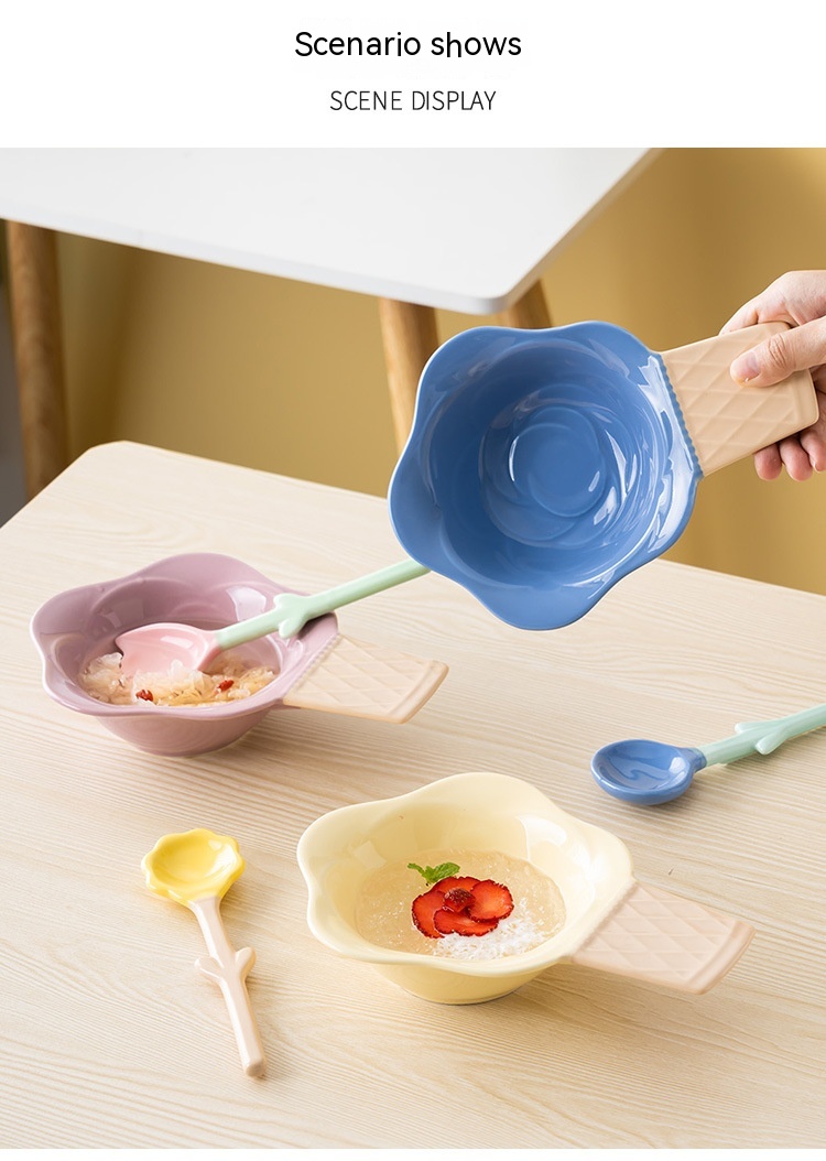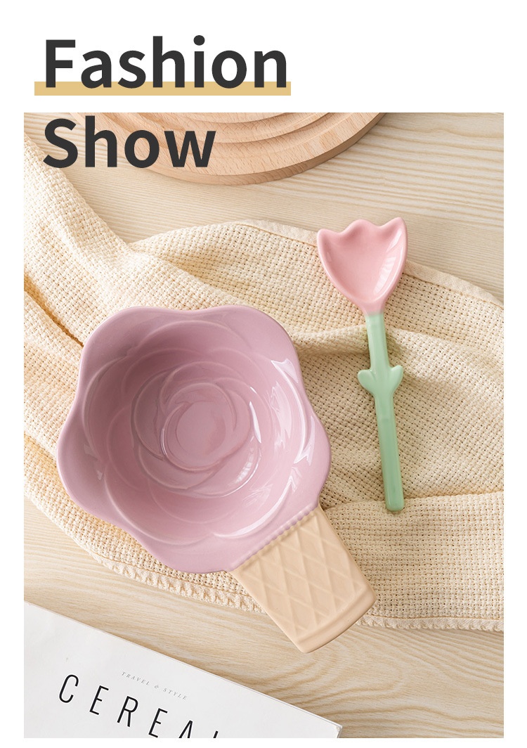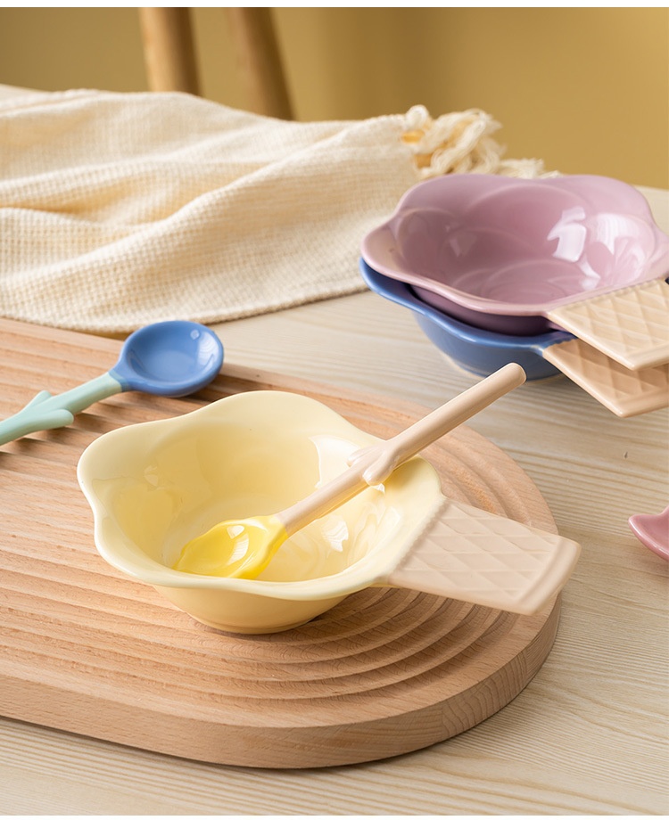 Color: purplish red ice cream bowl, purplish blue ice cream bowl, yellow ice cream bowl, tulip pink spoon, Hyacinth purplish blue spoon, Asian buttercup yellow spoon