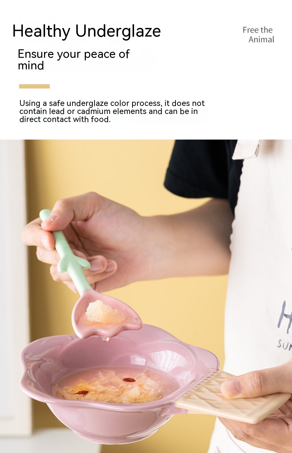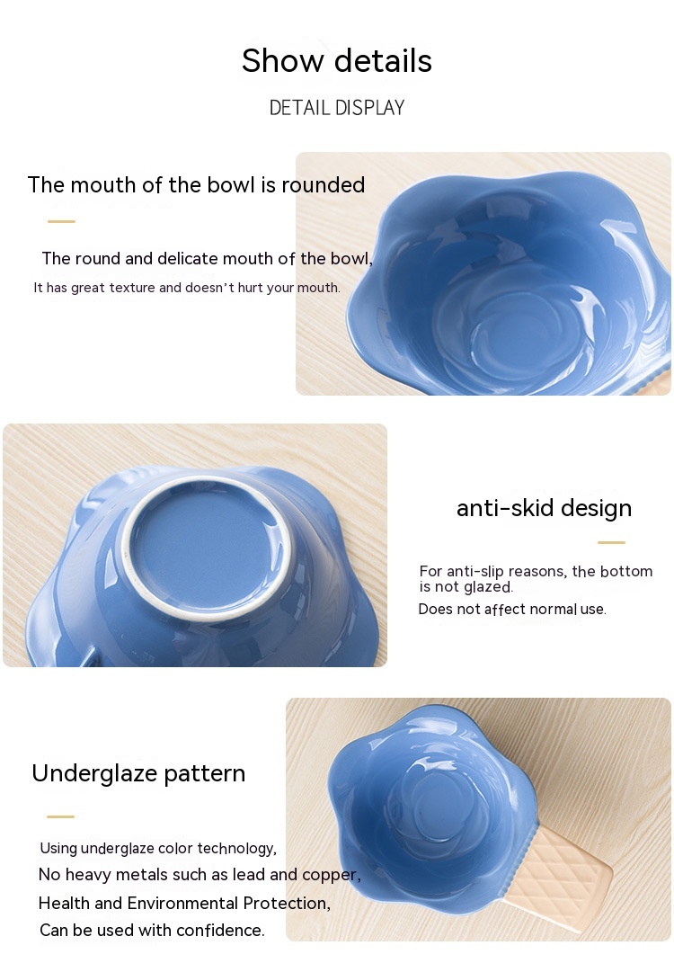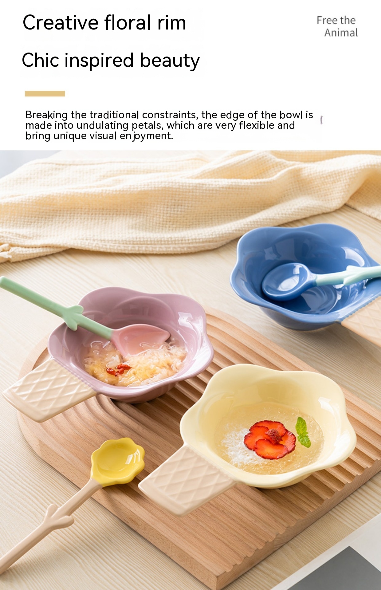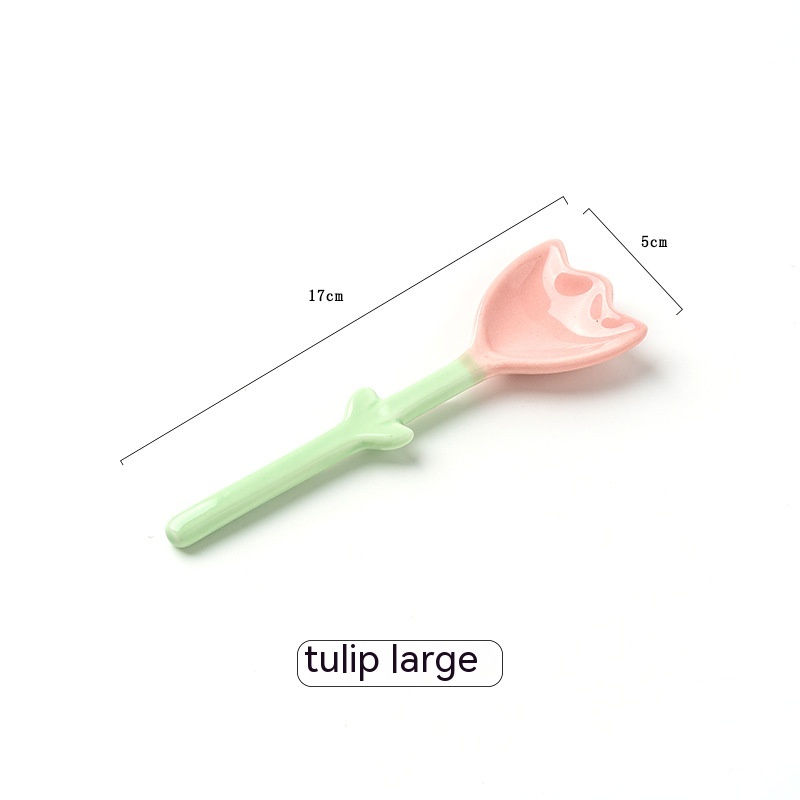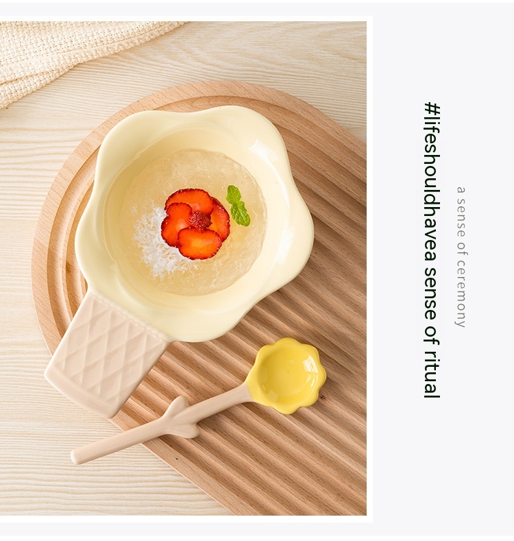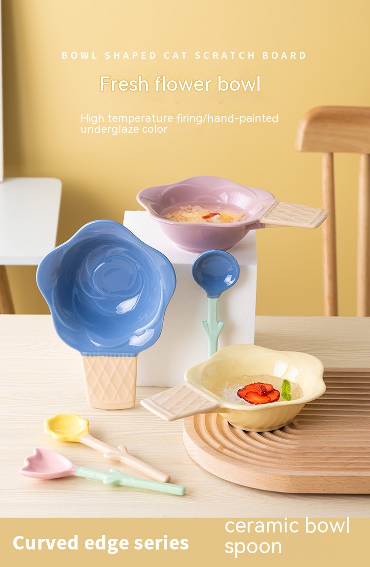 Color: purplish red ice cream bowl, purplish blue ice cream bowl, yellow ice cream bowl, tulip pink spoon, Hyacinth purplish blue spoon, Asian buttercup yellow spoon