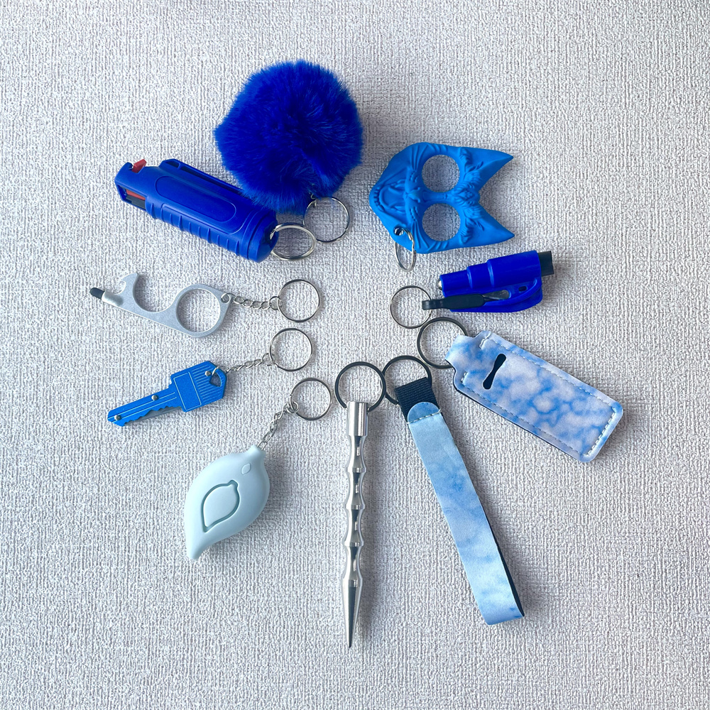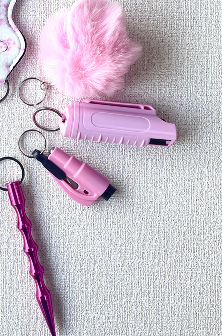 Pepper spray *1, alarm *1, window breaker *1, letter opener *1, cat head buckle *1, fur ball *1, wrist strap *1, lipstick bag *1, Kubaton*1, door opener *1.