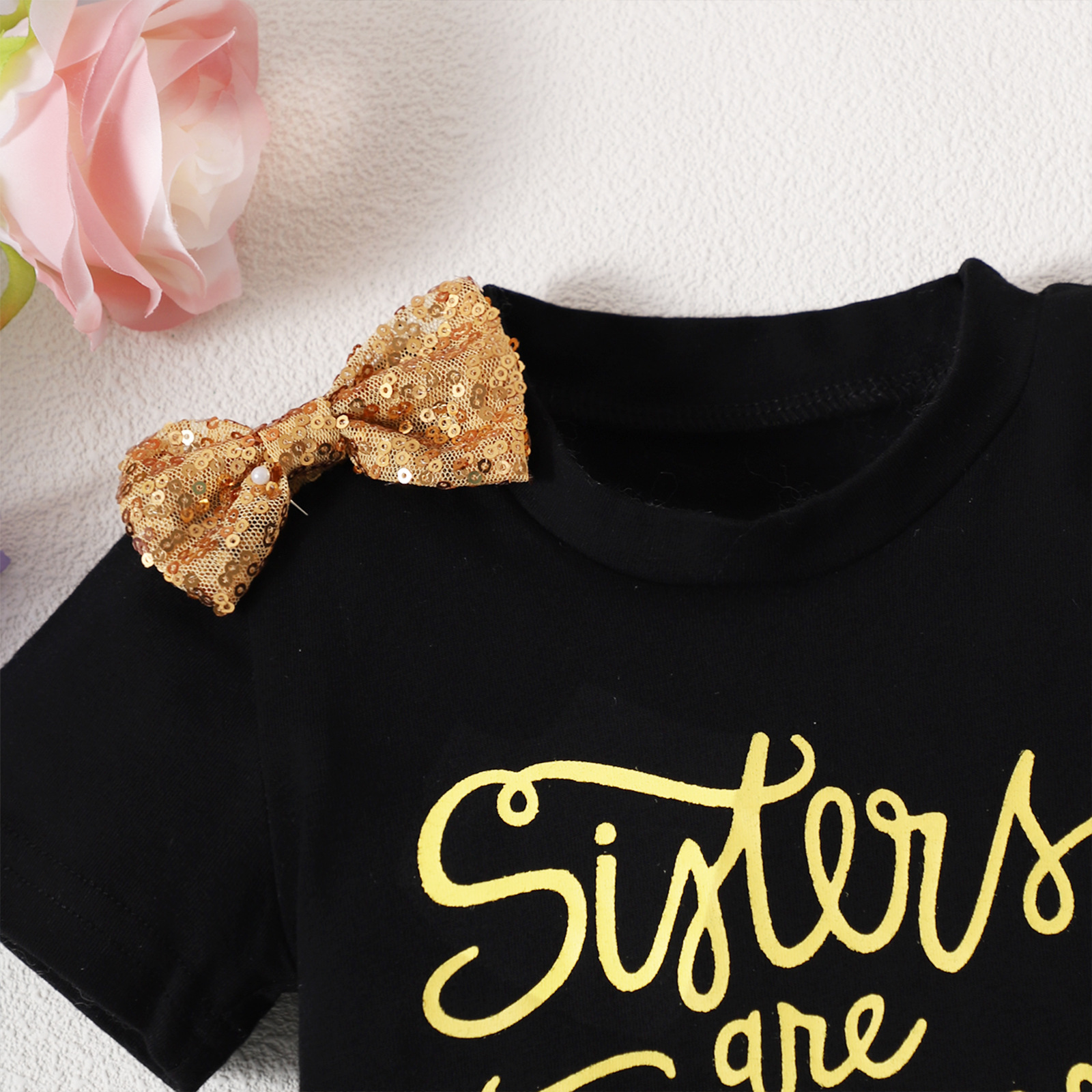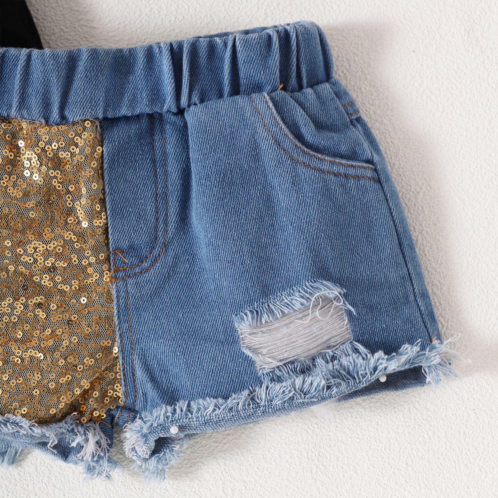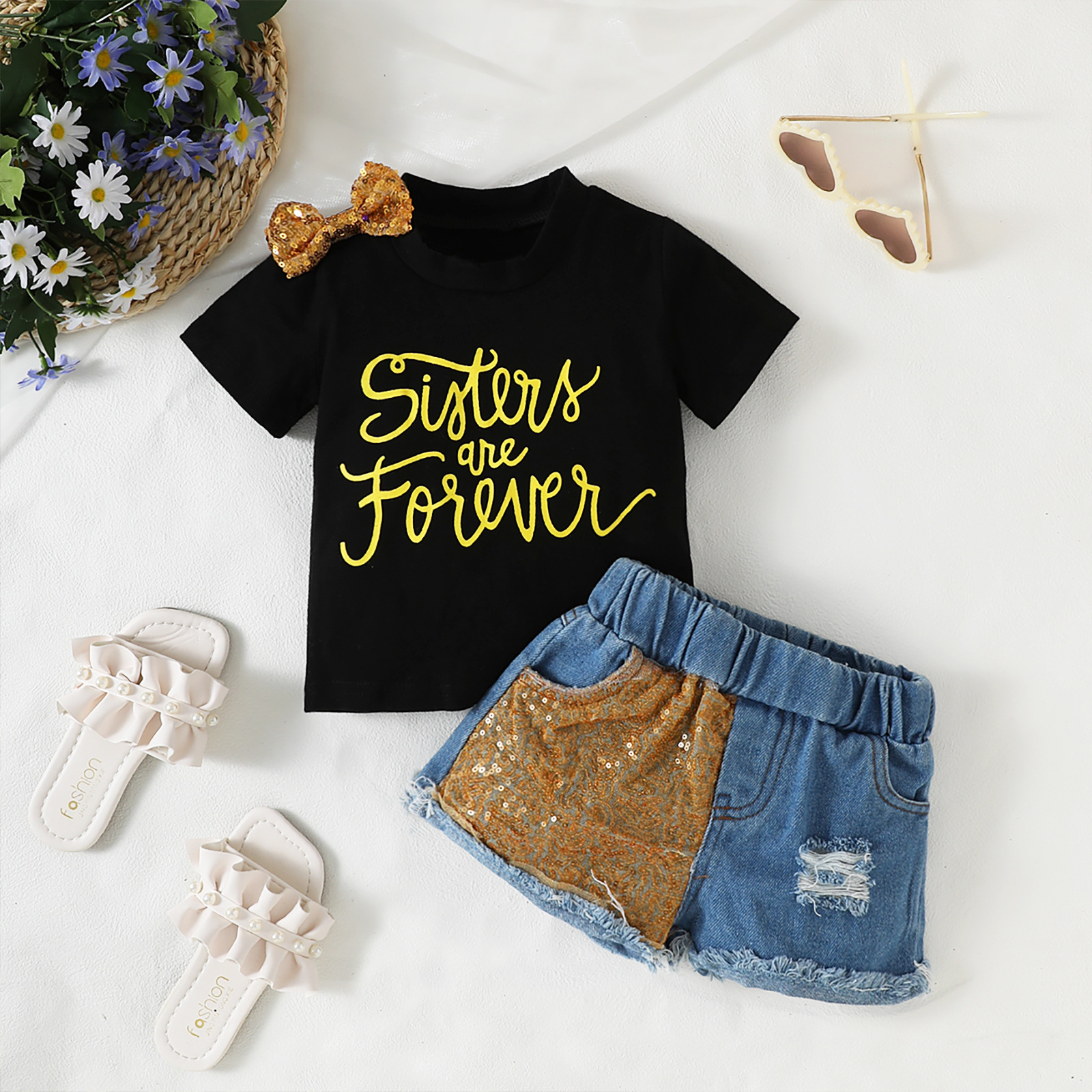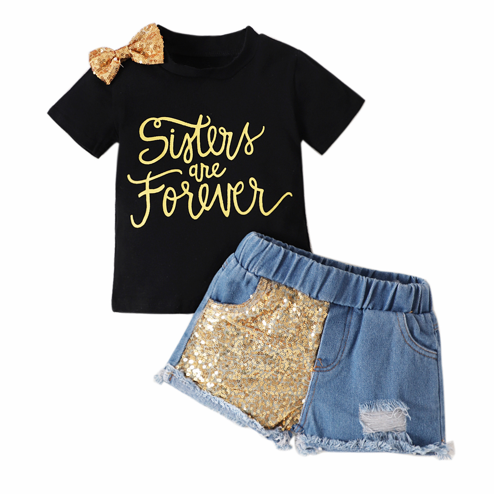 Girls Bow Short Sleeve Letter Jacket Phnom Penh Sequins Ripped Denim Shorts Suit