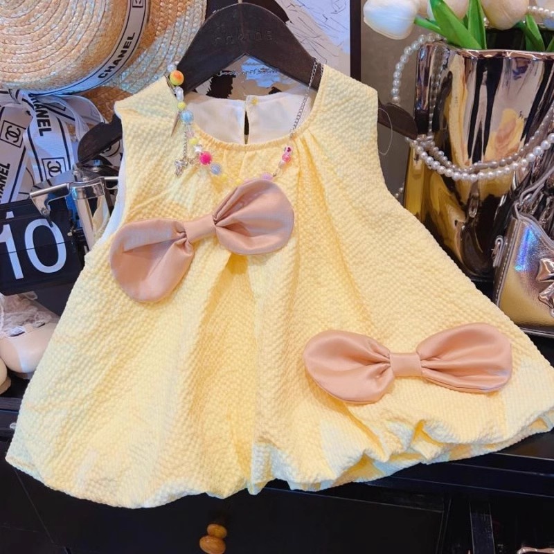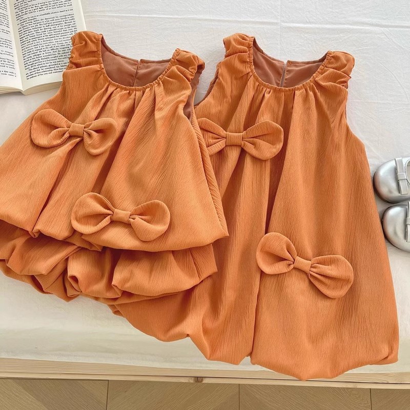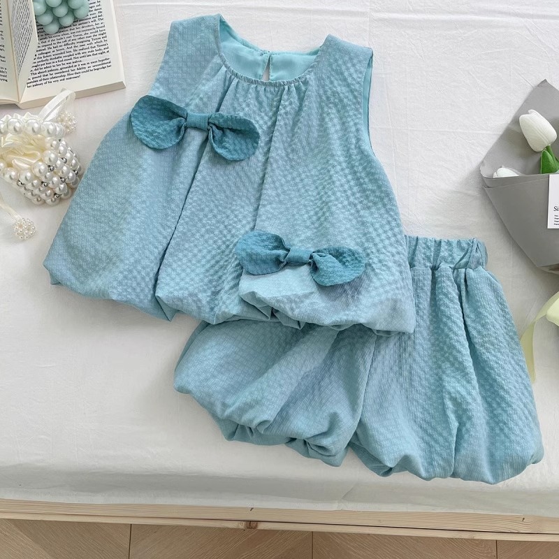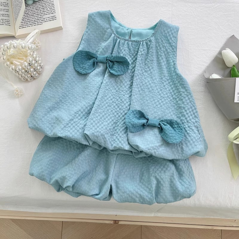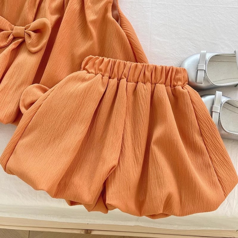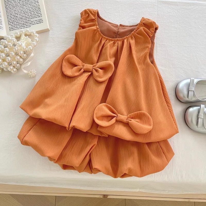Color: blue green bow Bud vest dress, orange bow Bud vest dress, yellow bow vest shorts two-piece set, blue green bow vest shorts two-piece set, orange bow vest shorts two-piece set