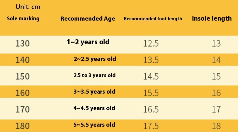 Size: inner length 13cm,[130] recommend foot length 12.5, inner length 14cm,[140] recommend foot length 13.5, inner length 15cm,[150] recommend foot length 14.5, inner length 16cm,[160] recommend foot length 15.5, inner length 17cm,[170] recommend foot length 16.5, inner length 18cm,[180] recommend foot length 17.5