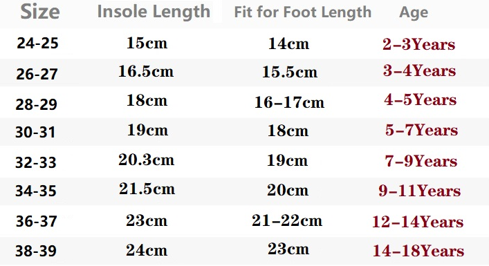 Size: inner length 15.0cm size 24-25, inner length 16.5cm size 26-27, inner length 18.0cm size 28-29, inner length 19.1cm size 30-31, inner length 20.3cm size 32-33, inner length 21.5 cm 34-35 yards, inner length 23.0cm 36-37 yards, inner length 24.0cm 38-39 yards