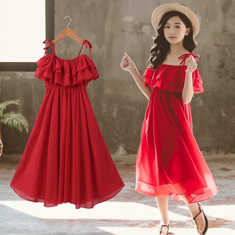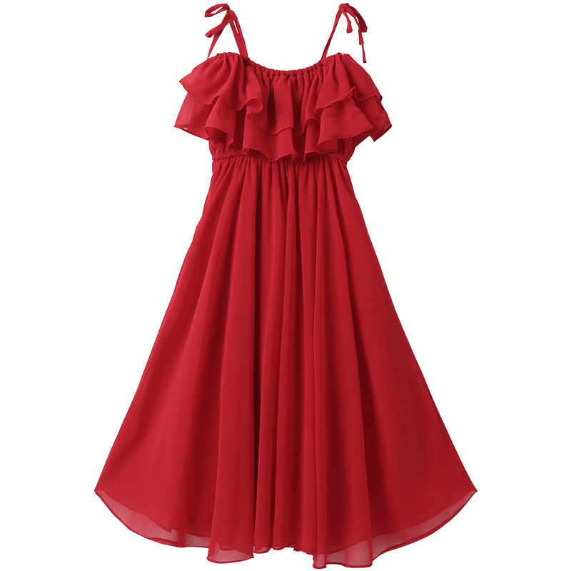 Color: red suspender skirt, dark green suspender skirt