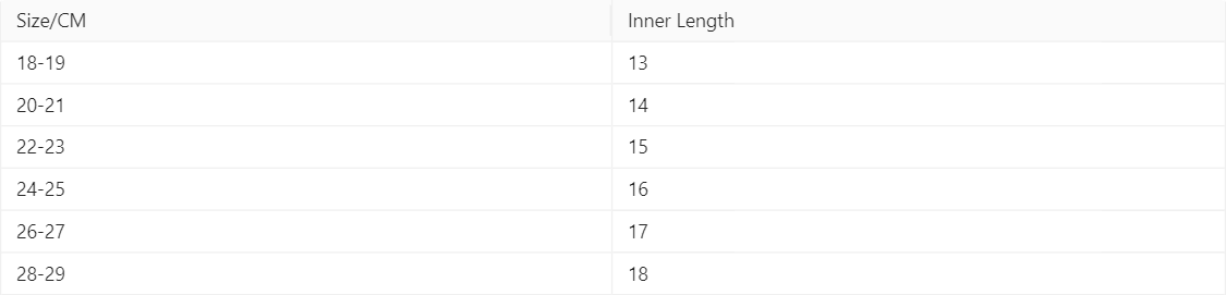 Size: The inner length of 18-19 yards is about 13CM, the inner length of 20/21 yards is about 14CM, the inner length of 22-23 yards is about 15CM, and the inner length of 24/25 yards is about 16CM, the length within 26/27 yards is about 17CM, and the length within 28/29 yards is about 18CM