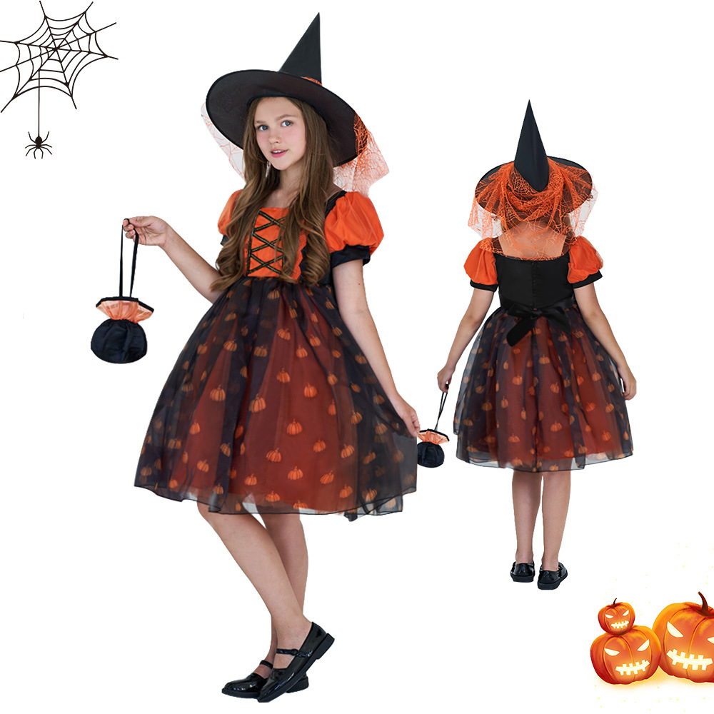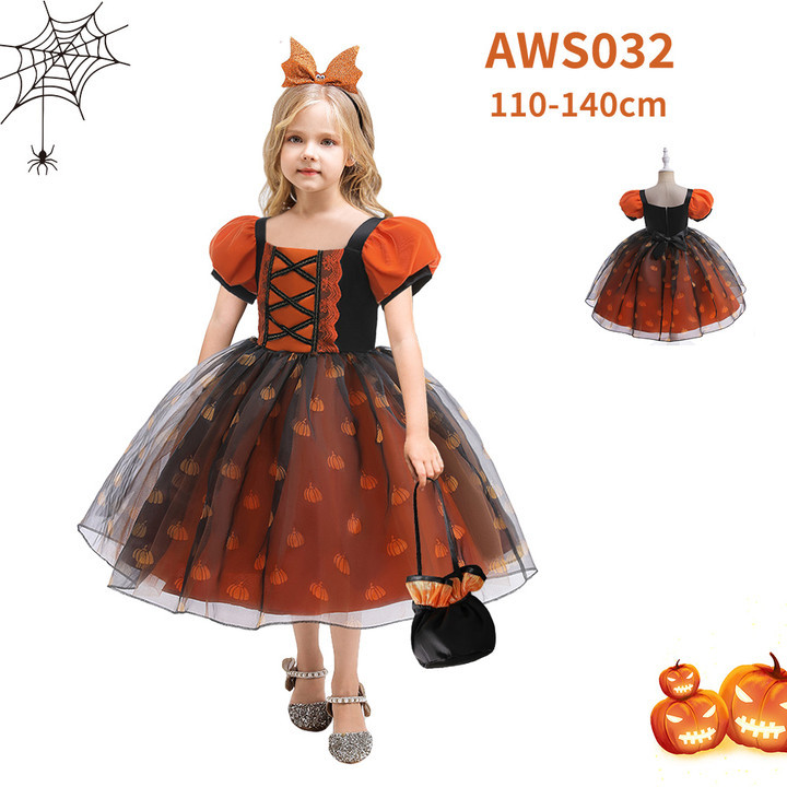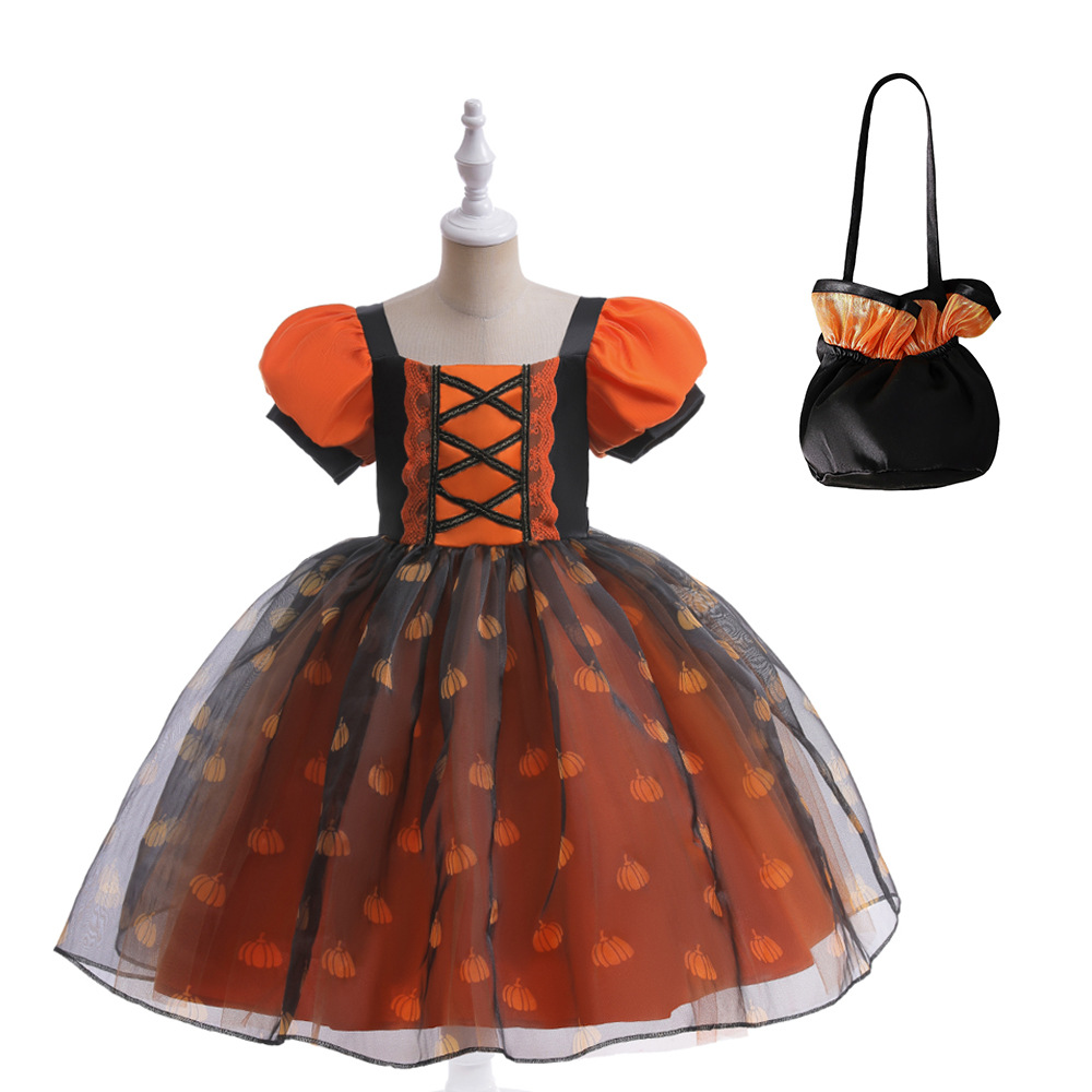 Girls Fashion Orange Pumpkin Makeup Ball Performance Costume Princess Dress