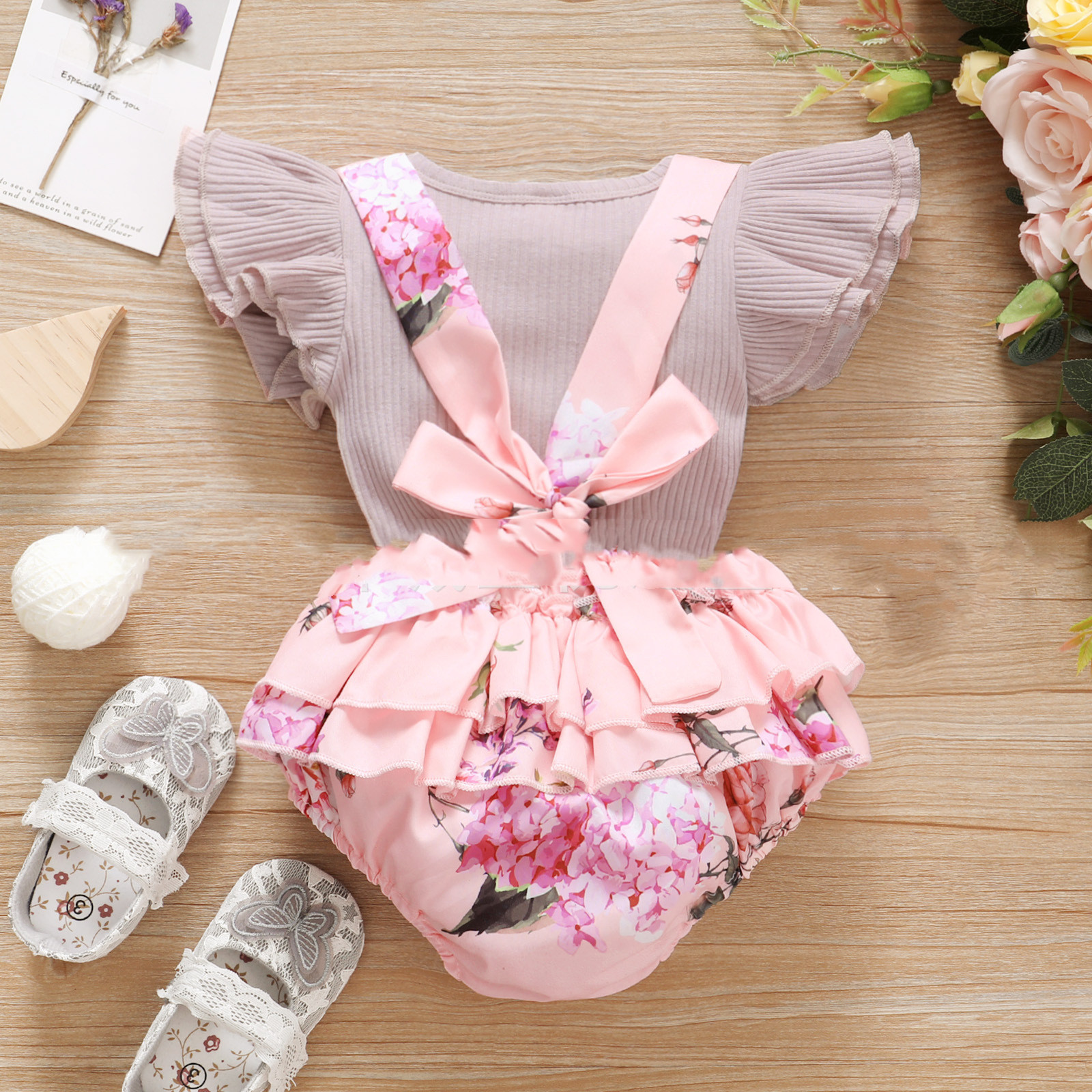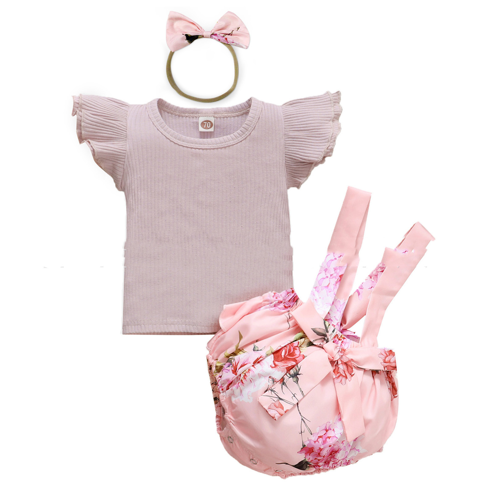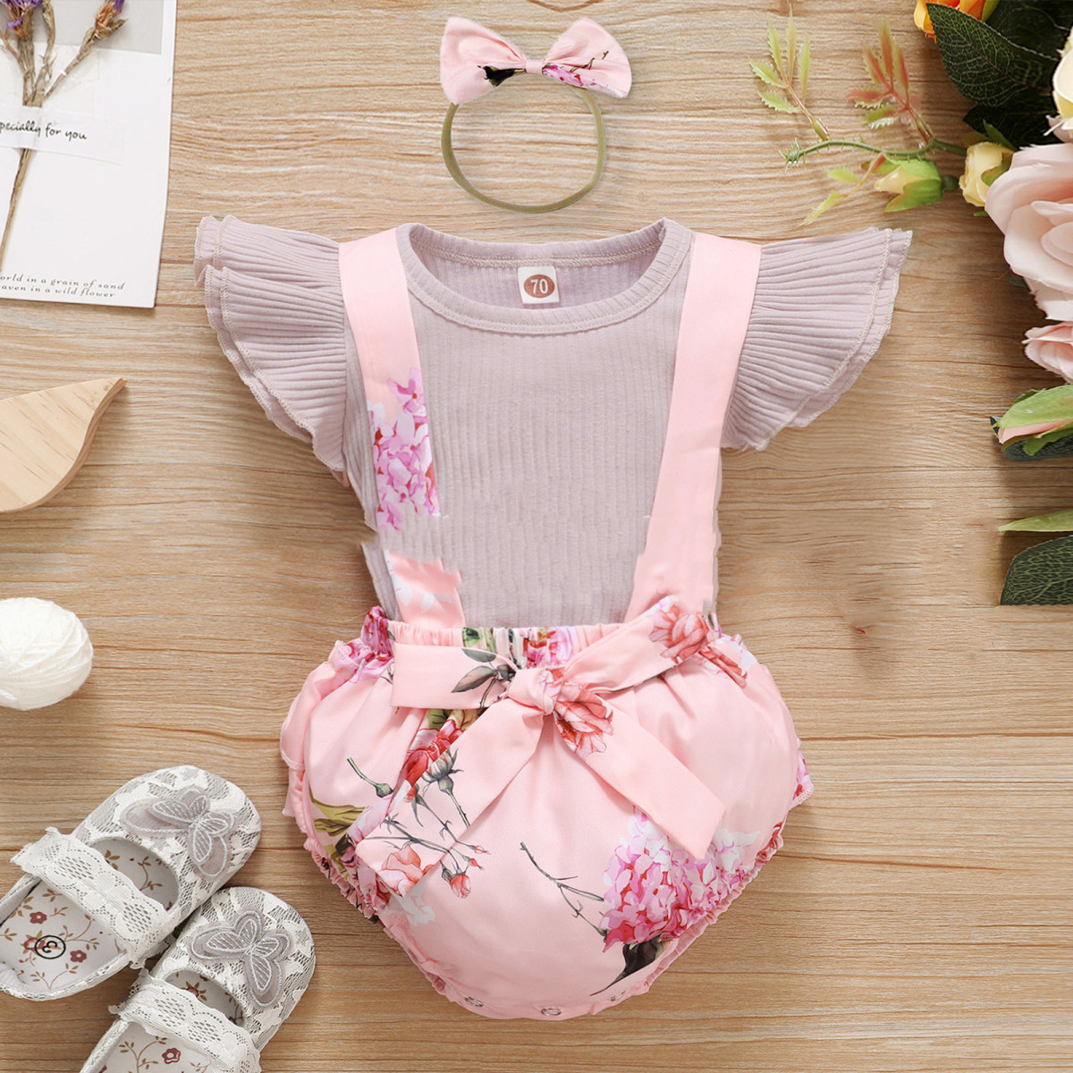 Girls' Fashion Sunken Stripe Romper Flower Suspender Shorts Three-piece Suit