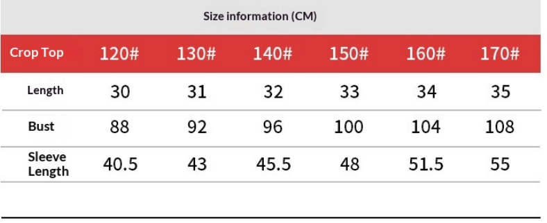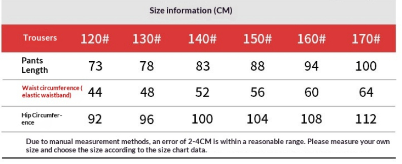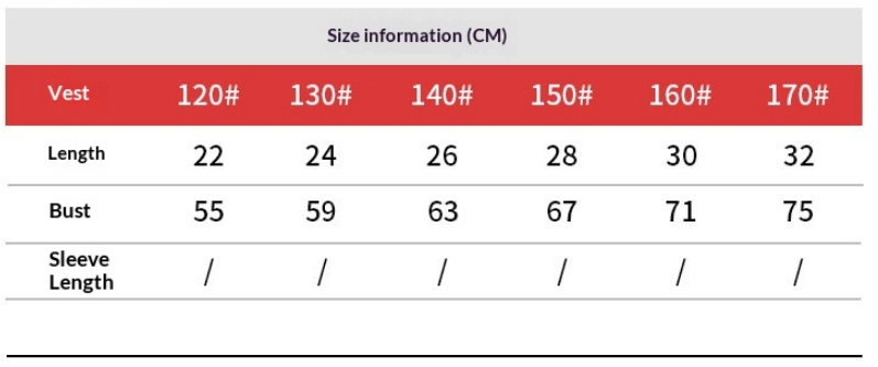 Sizes: 120cm—suitable for actual heights of 116–125cm; 130cm—suitable for actual heights of 126–135cm; 140cm—suitable for actual heights of 136–145cm; 150cm—suitable for actual heights of 146–155cm; 160cm—suitable for actual heights of 156–165cm; 170cm—suitable for actual heights of 166–175cm.