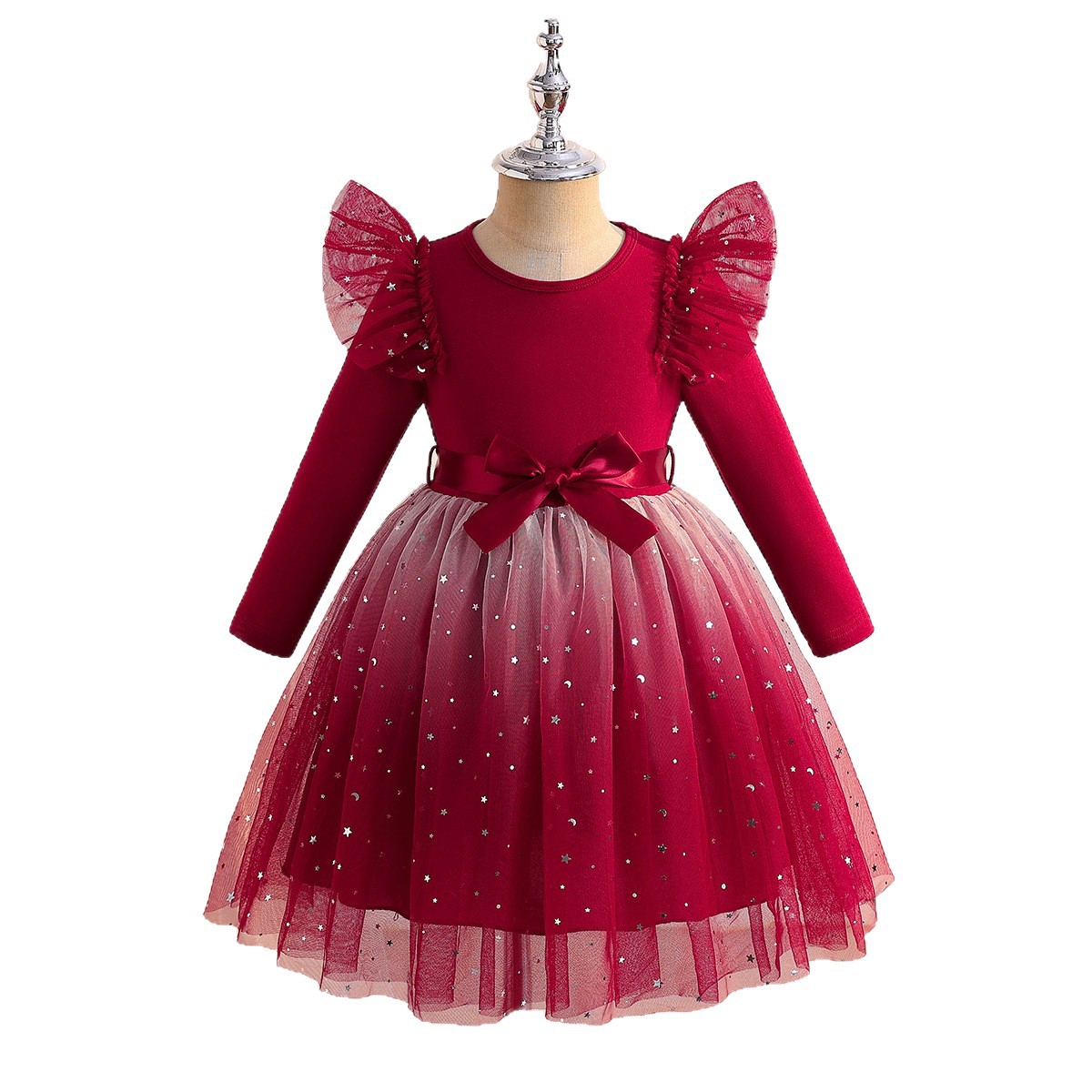 Girls Long-sleeve Gradient Multicolor Tulle Dress With A Waist Belt