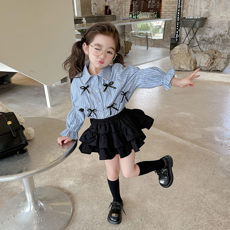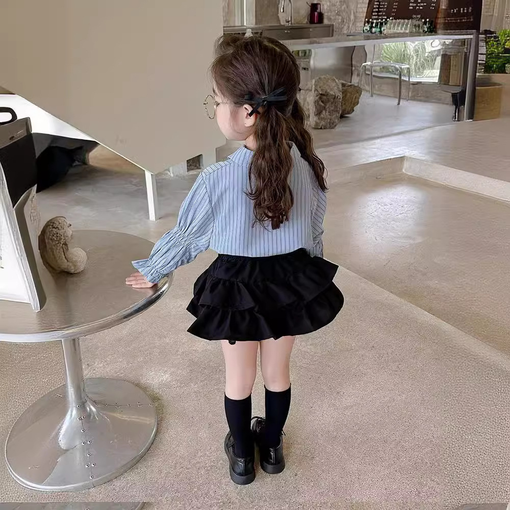 Color: black two-layer skirt blue striped butterfly shirt, blue striped butterfly shirt, black two-layer skirt