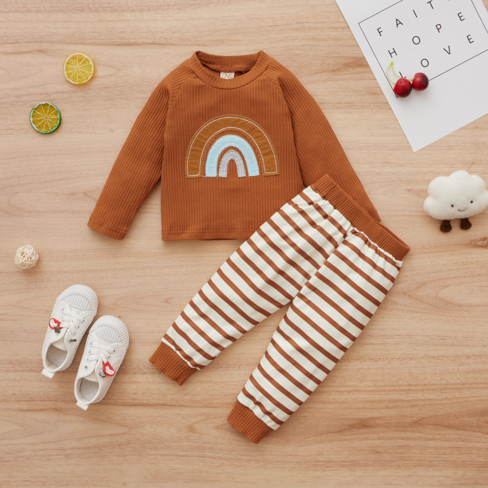 Girls' Sports Long-sleeved Pullover Without Hood Rainbow Cotton Sweater And Trousers Suit