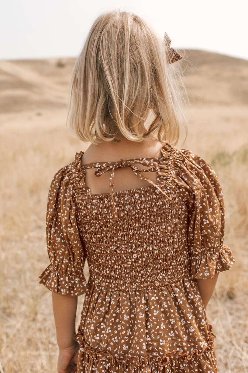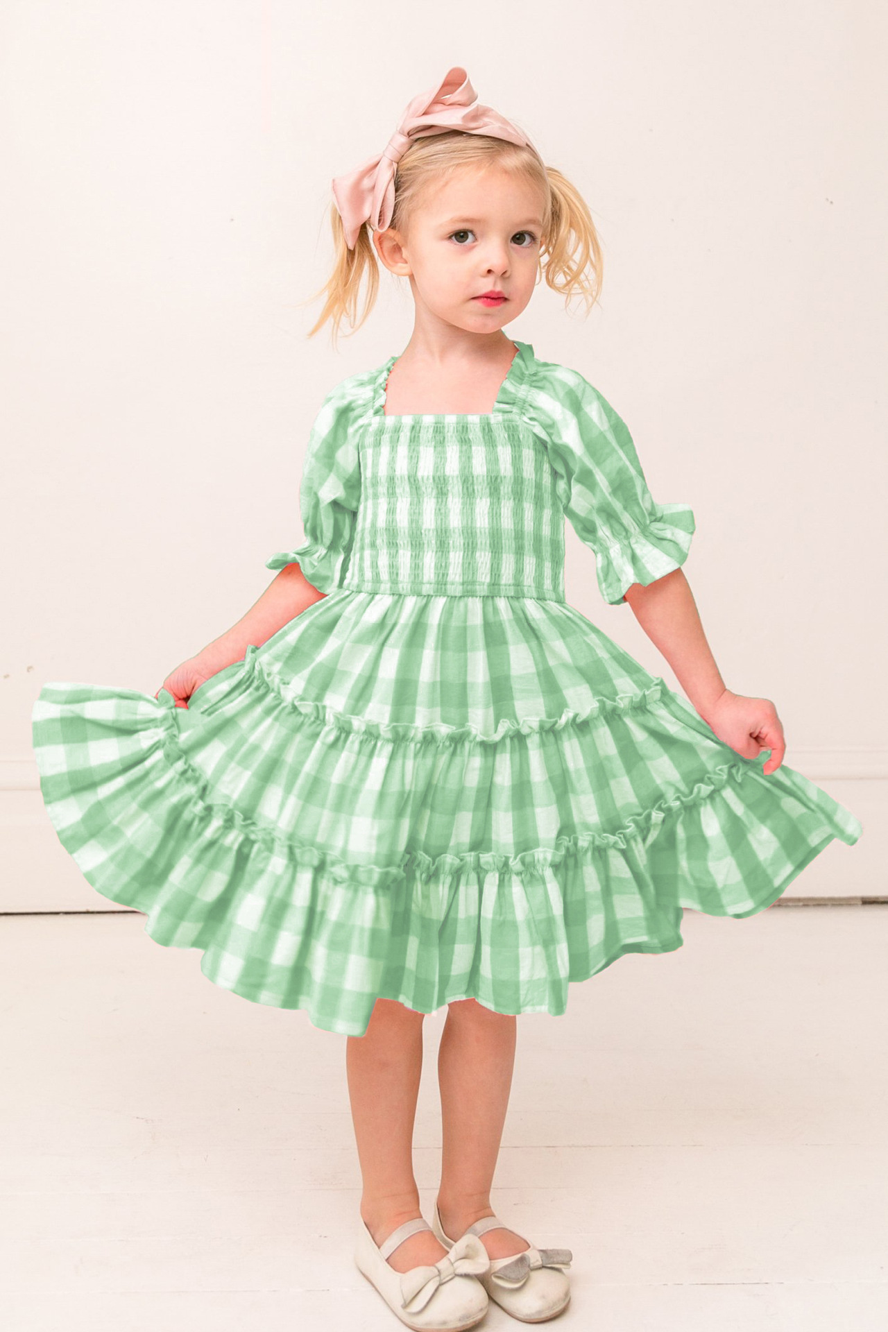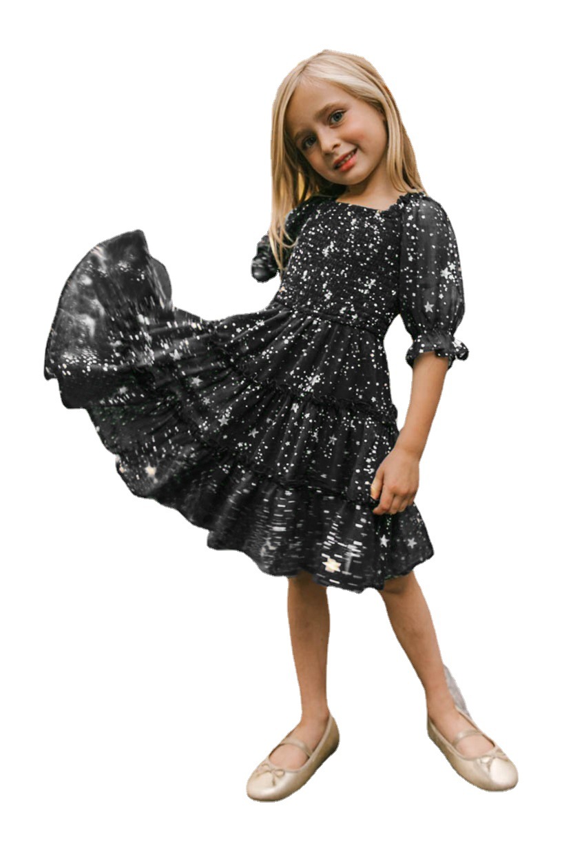 Girls Square Neck Lantern Short Sleeve Ruffle Pleated Princess Dress