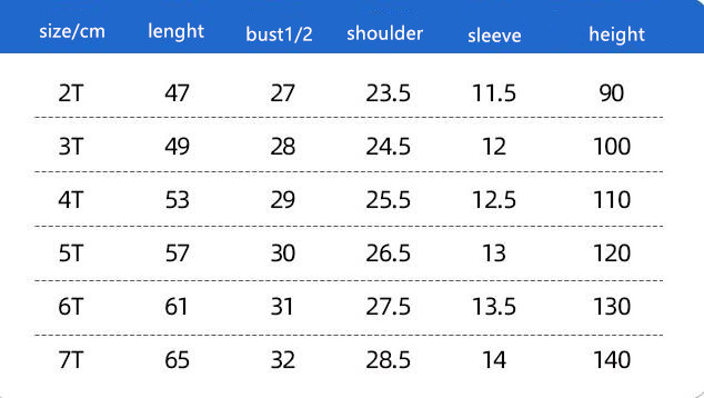Suitable for height: 2T(90), 3T(100), 4T(110), 5T(120), 6T(130), 7T(140)