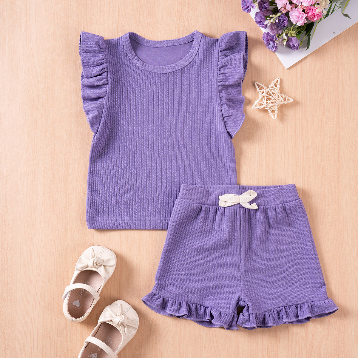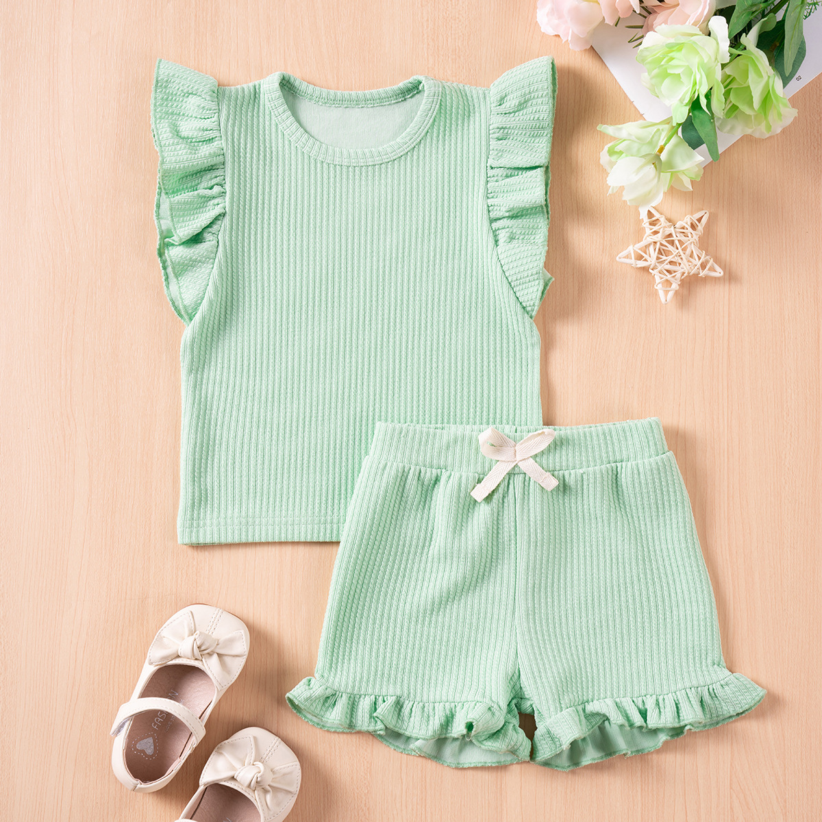 Girls' Summer Suits Solid Color Casual Flounced Sleeve Shorts
