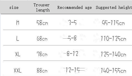 Suitable height: M (height 95-115cm) 3-5 years old, L (height 110-125cm) 5-8 years old, XL (height 125-140cm) 8-12 years old, XXL (height 140-155cm) 12-15 years old
