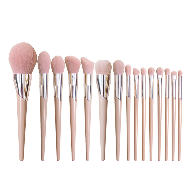 #1 loose powder brush, #2 flame blush brush, #3 peach heart highlight brush, #4 bevel contour brush, #5 foot double-sided contour brush, #6 foundation brush, #7 round head highlight brush, #8 Nose shadow brush, #9 oblique eye shadow brush, #10 round head oblique blending brush, #11 base eye shadow brush, #12 triangle color eye shadow brush, #13 medium blooming brush, #14 small eye shadow brush ,#15 Eye socket lying silkworm brush