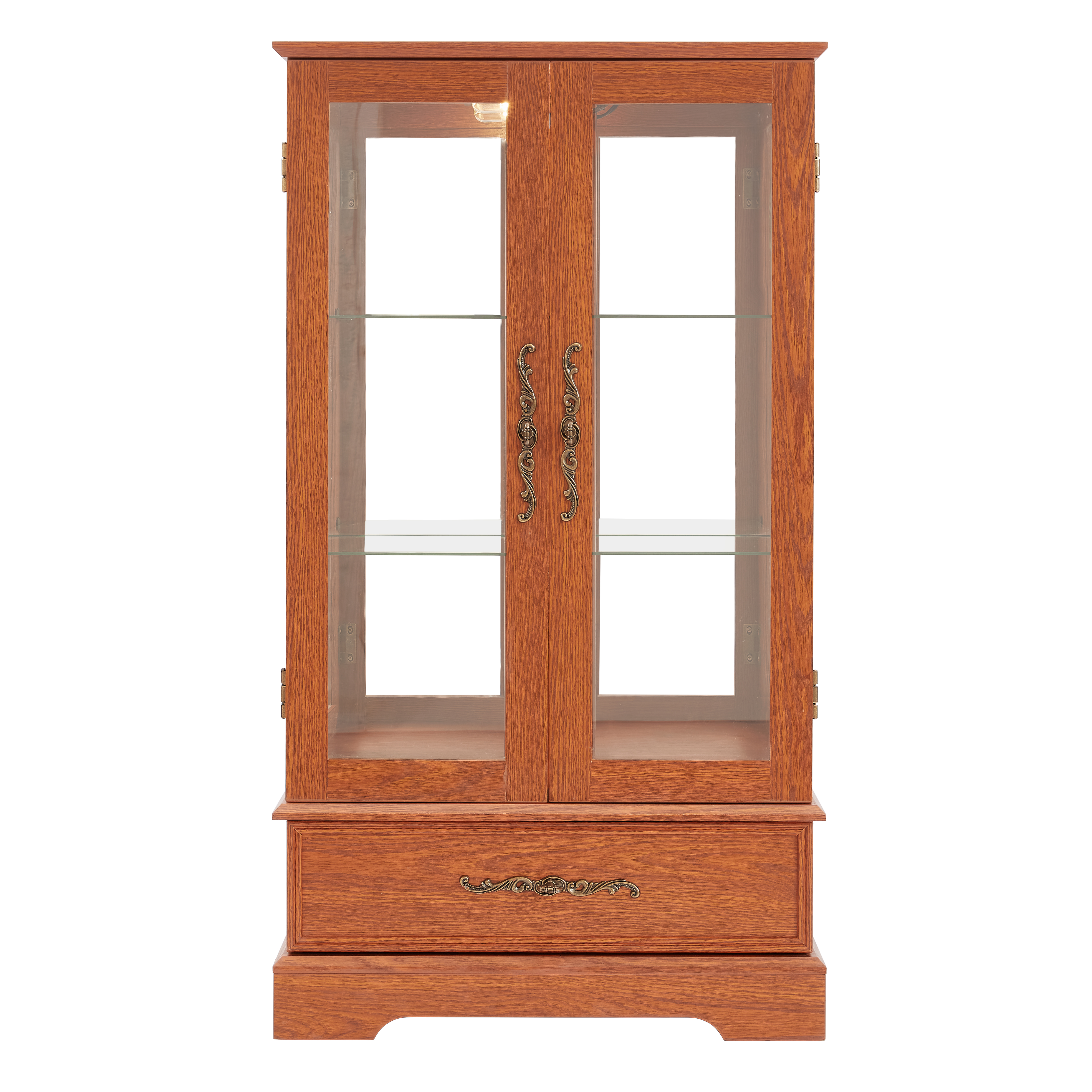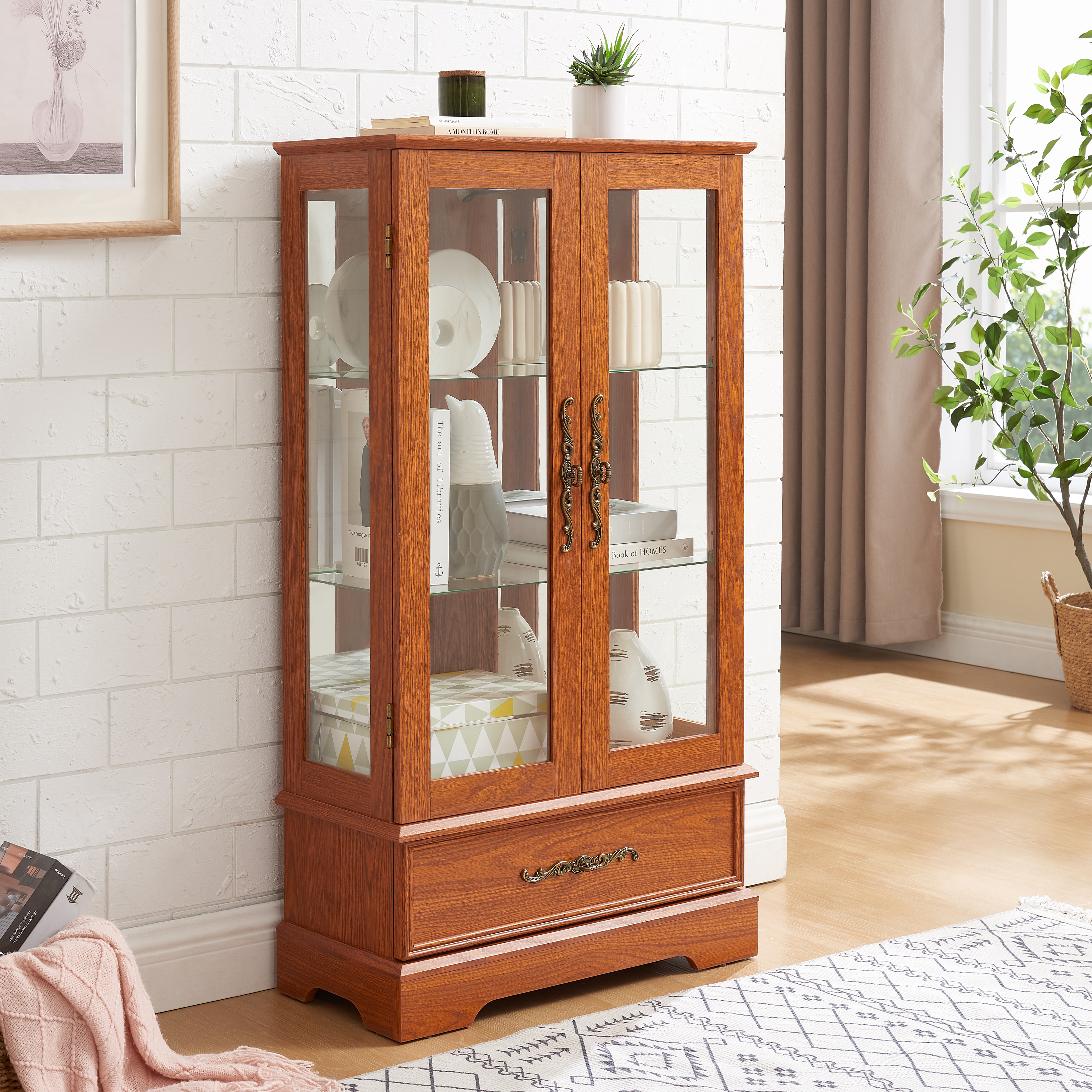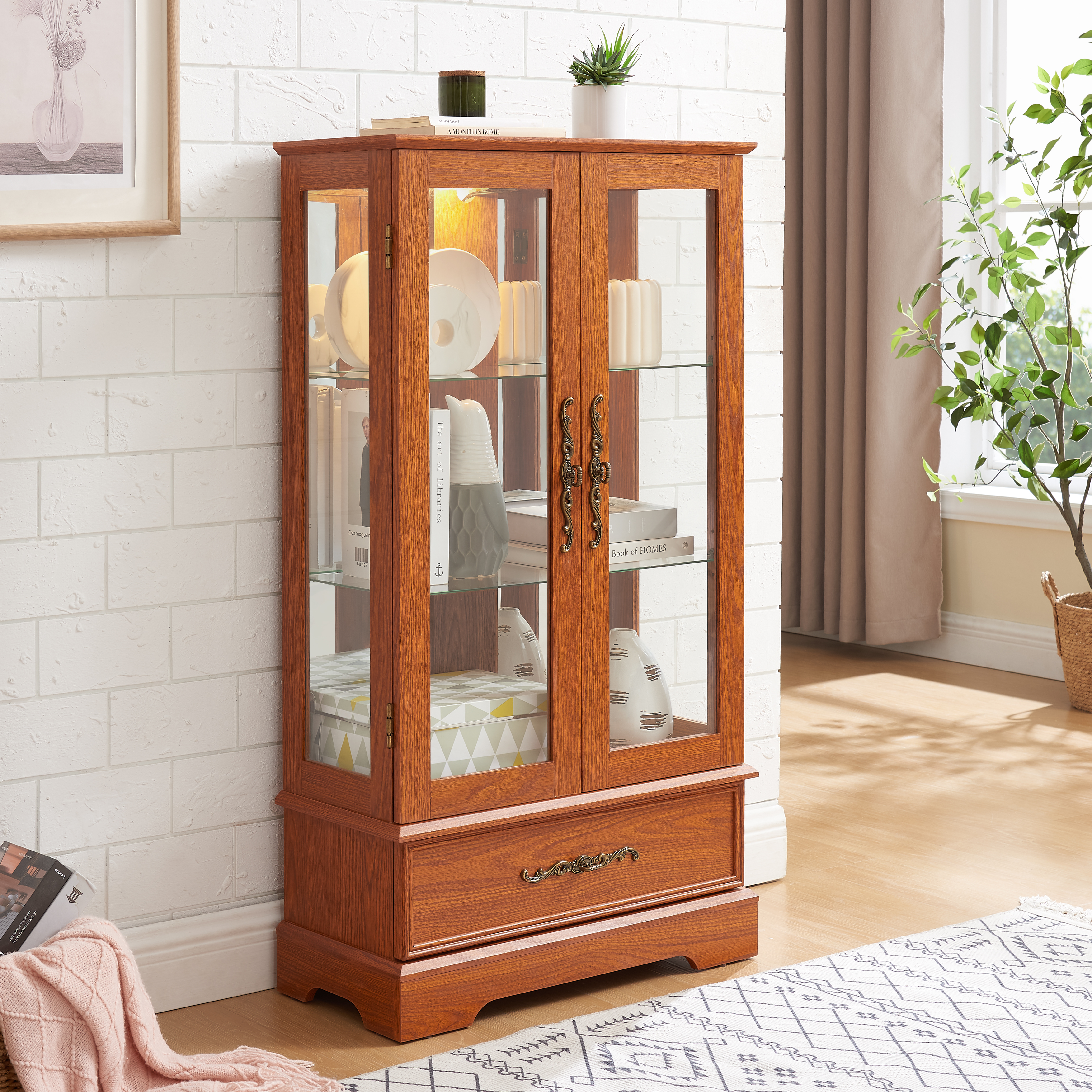 Product Name:Glass Cabinet Lighted Glass Cabinet Curio Display Cabinet with Adjustable Glass Shelves 2 Doors and 1 drawer Cabinet Bulb Included DARK OAK