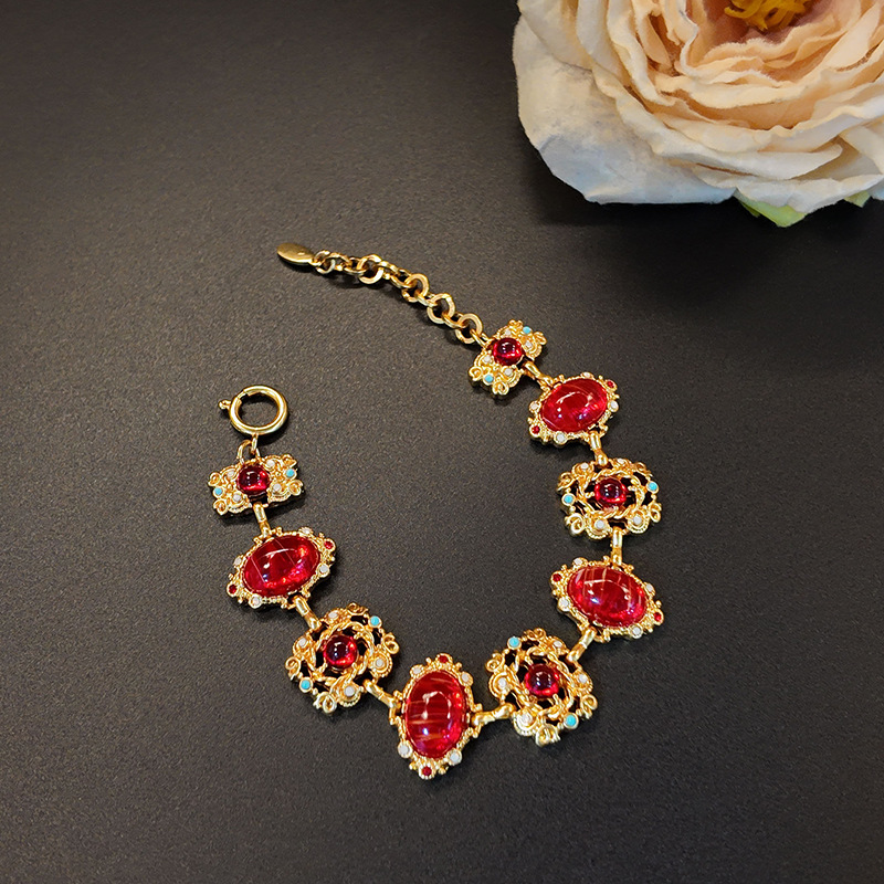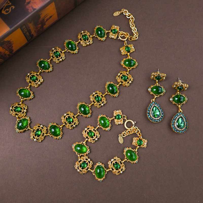 Color: green necklace, green ear studs, green bracelet, red necklace, red stud earring, red bracelet