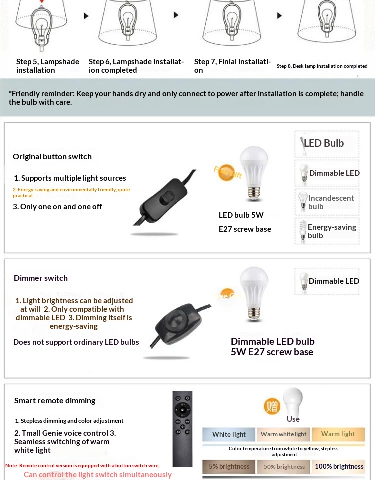 Switch type: Remote control switch, push-button switch, dimmer switch