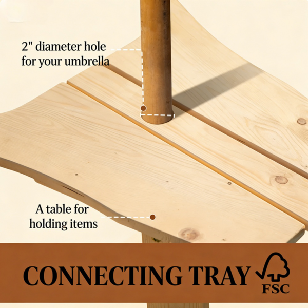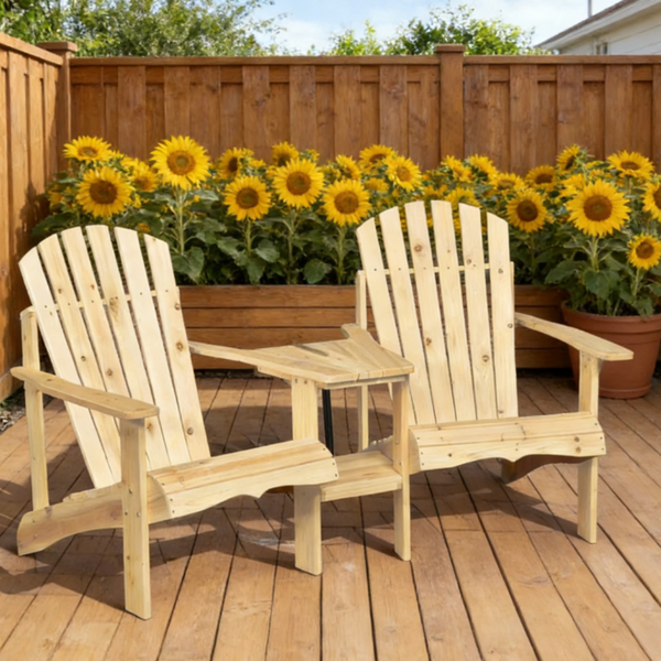 Features: - Double Adirondack chair bench with a middle table in between - Rustic fir wood - Relaxed sloping seat - Reclined back for extra comfort - Breathable slat design - 2" diameter hole in the center of the table for holding an umbrella - Assembly required Specification: - Color: Natural - Material: Fir Wood - Overall Dimensions: 67" L x 34.25" W x 36.25" H - Seat Dimensions: 21.75" W x 20.5" D - Seat to Floor Height: 15.25" H - Weight Capacity: 264 lbs. (Chair), 33 lbs. (Table)