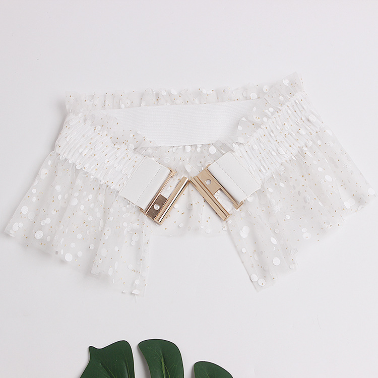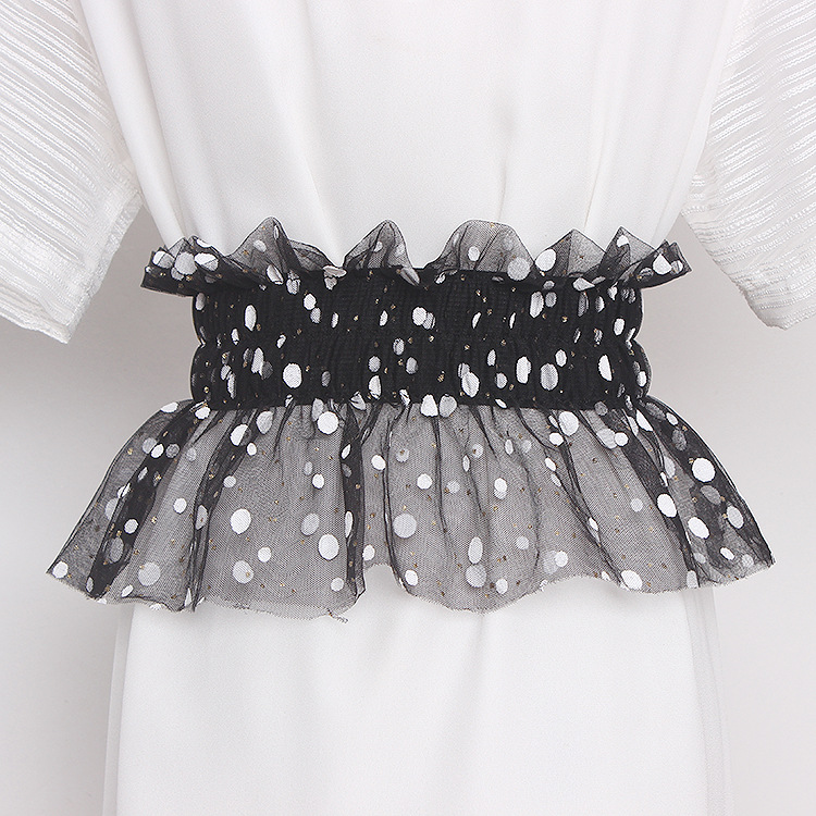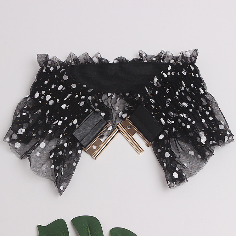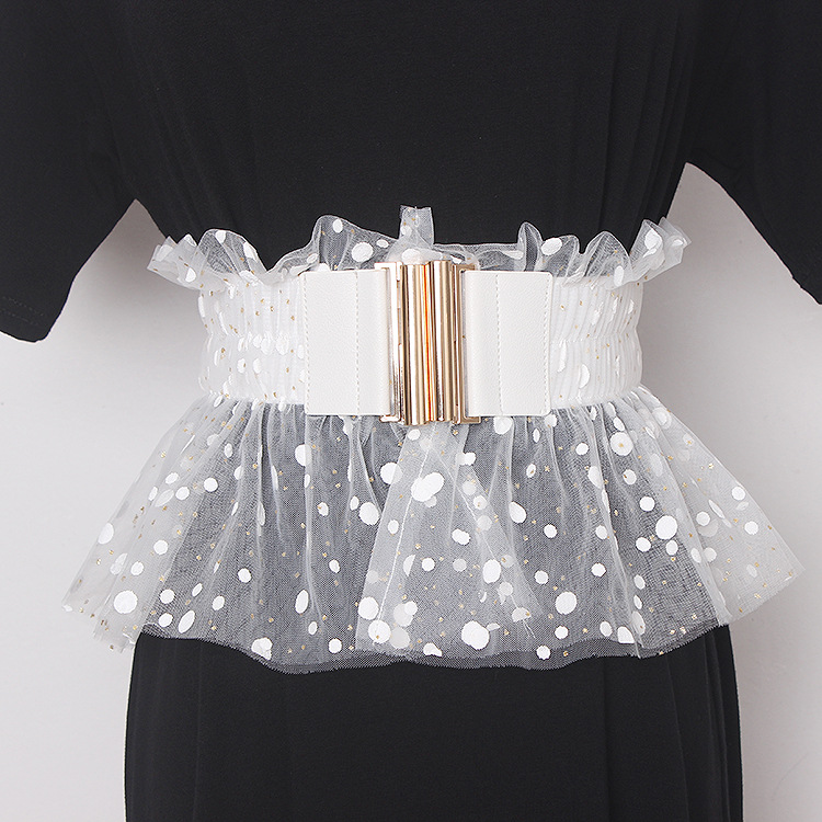 Glitter Polka Dot Mesh Pleated Elastic Waist Metal Double Buckle Wide Belt Girdle