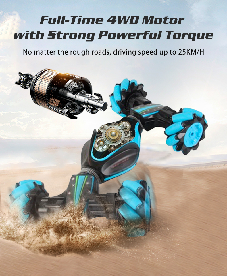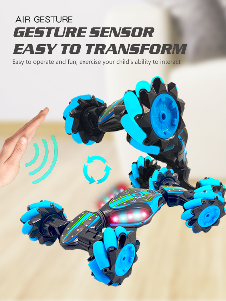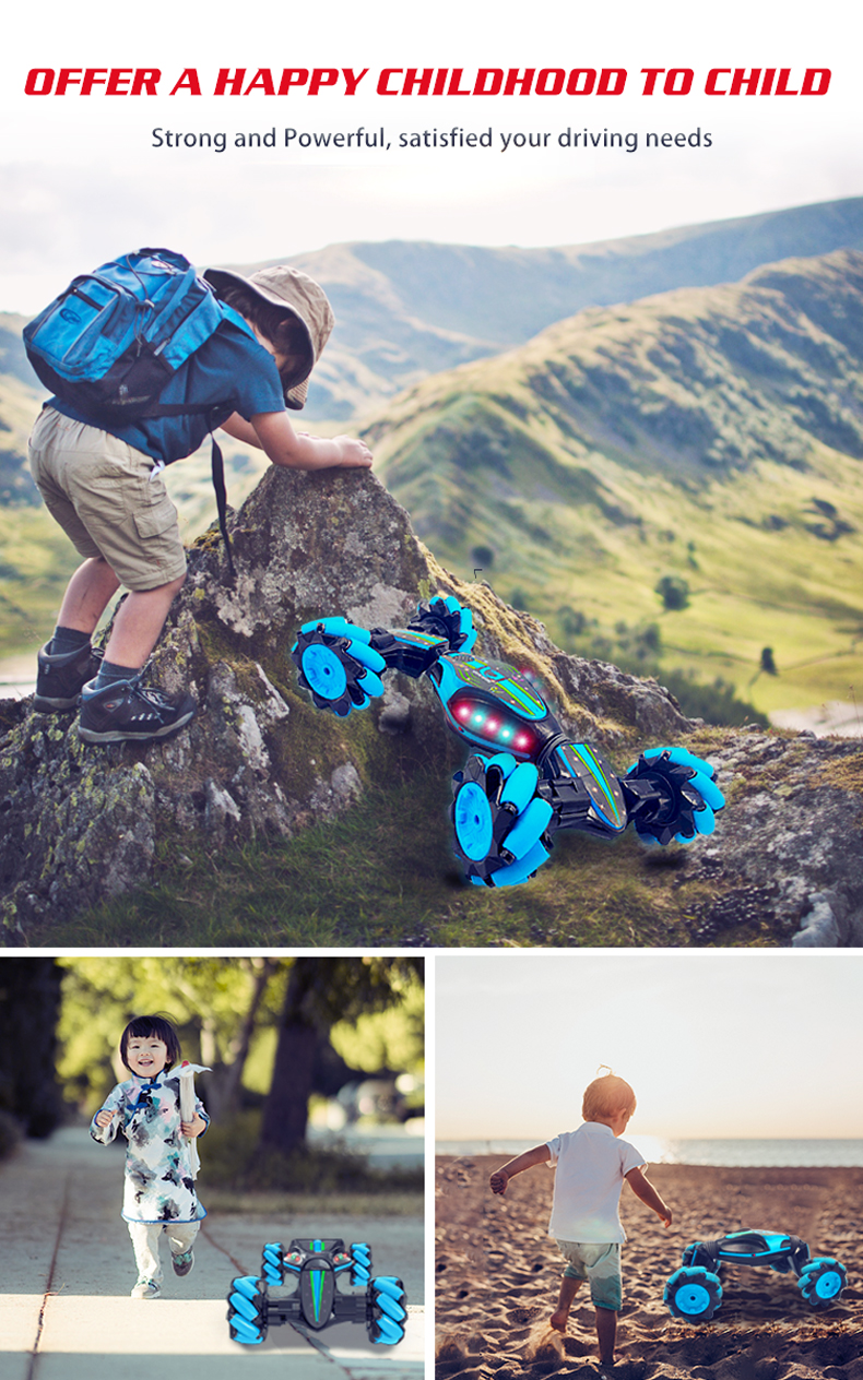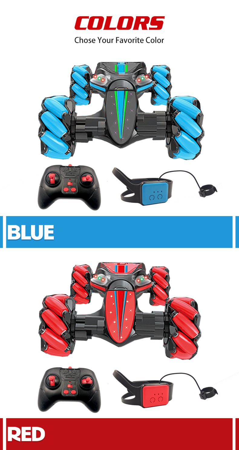 3.Gesture Sensing Control: The stunt car toy contains watch, gesture remote control,2.4G remote control technology. Change your gesture. and freely combine forward, backward, left/right turn, flip drive and high chassis replacement.