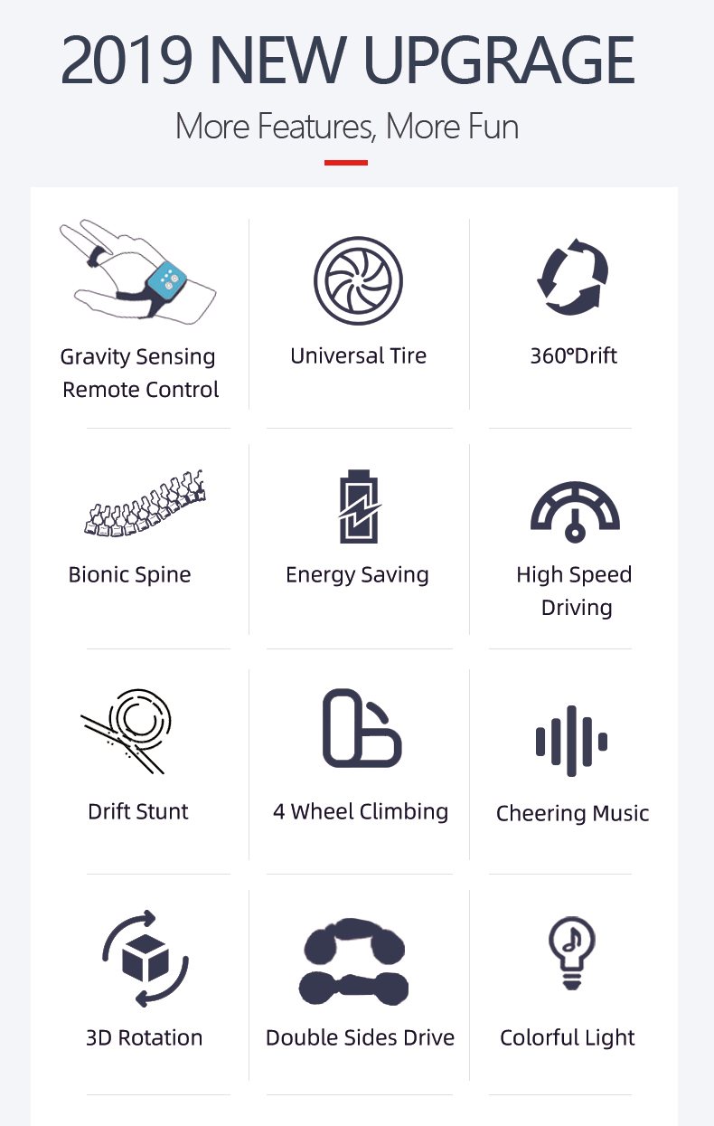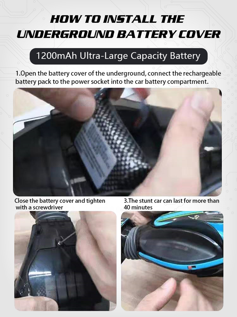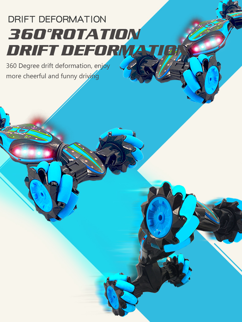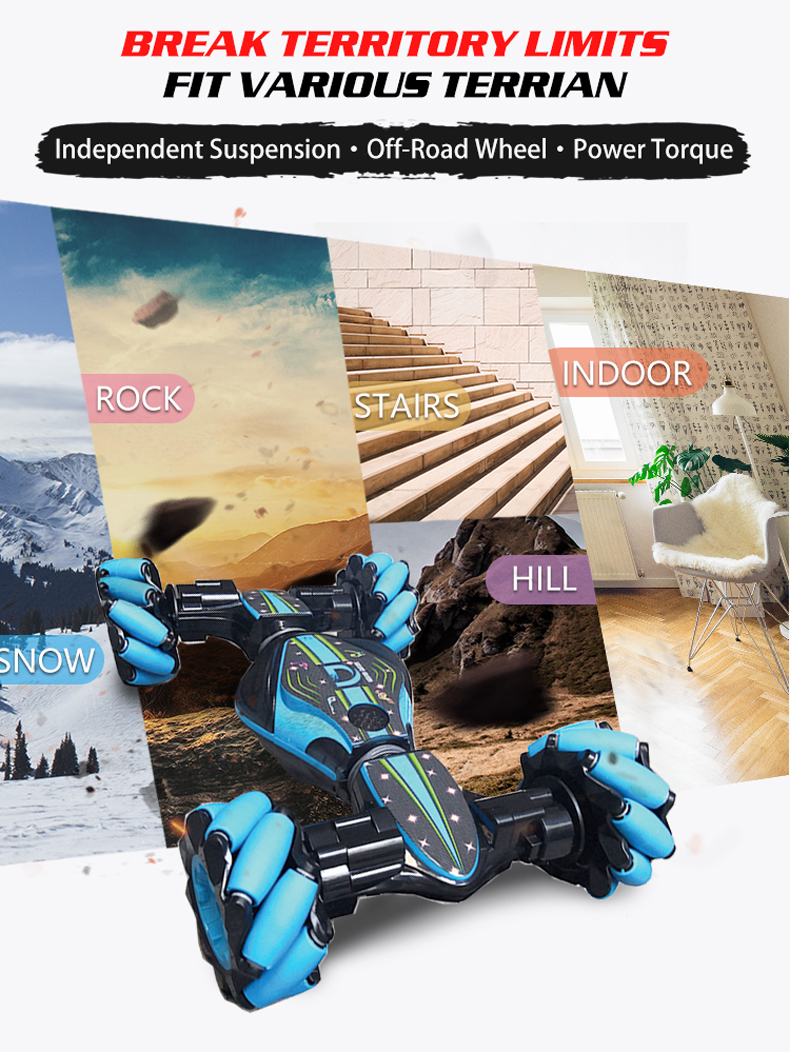 3.Gesture Sensing Control: The stunt car toy contains watch, gesture remote control,2.4G remote control technology. Change your gesture. and freely combine forward, backward, left/right turn, flip drive and high chassis replacement.