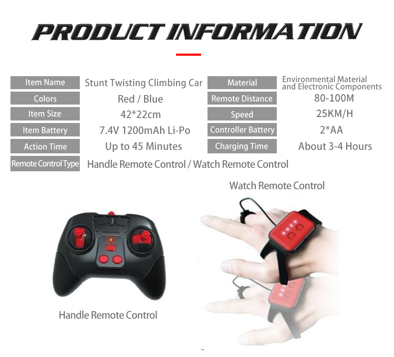 1*Stunt Car,1*USB CABLE,1*USER MANUAL, 2*Remote control (Handle & Watch )
