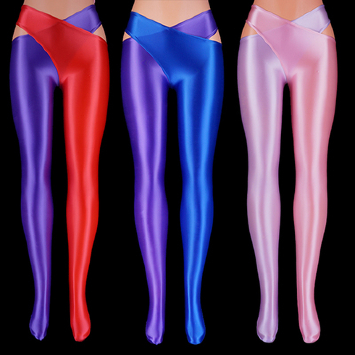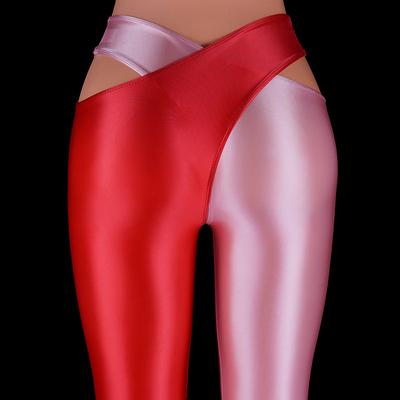 Glossy Leggings Patchwork Color Cross Open Crotch Pants