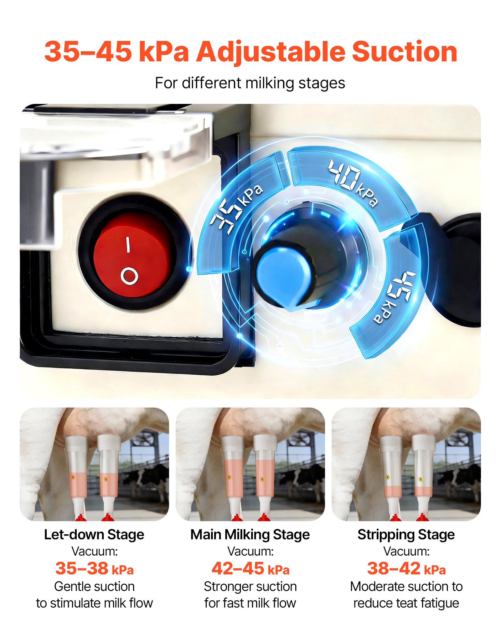 Adjustable Suction & Power: With a 35-45 kPa vacuum range, this pulsation vaccum electric milker suits milking stages from stimulation to final milk-out. Precise suction ensures smoother flow, while 25% higher power delivers more efficient performance