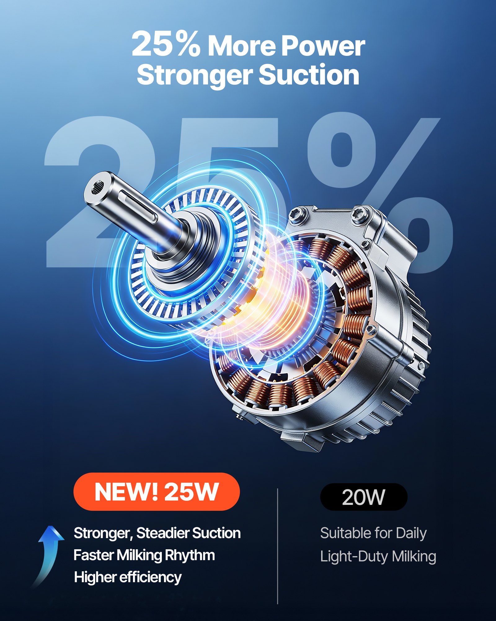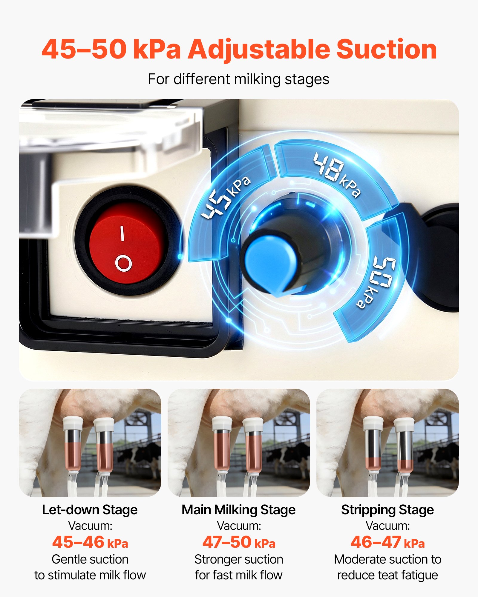 Adjustable Suction & Power: With a 45-50 kPa vacuum range, this pulsation vaccum electric milker suits milking stages from stimulation to final milk-out. Precise suction ensures smoother flow, while 25% higher power delivers more efficient performance