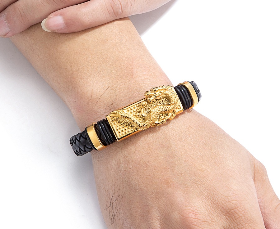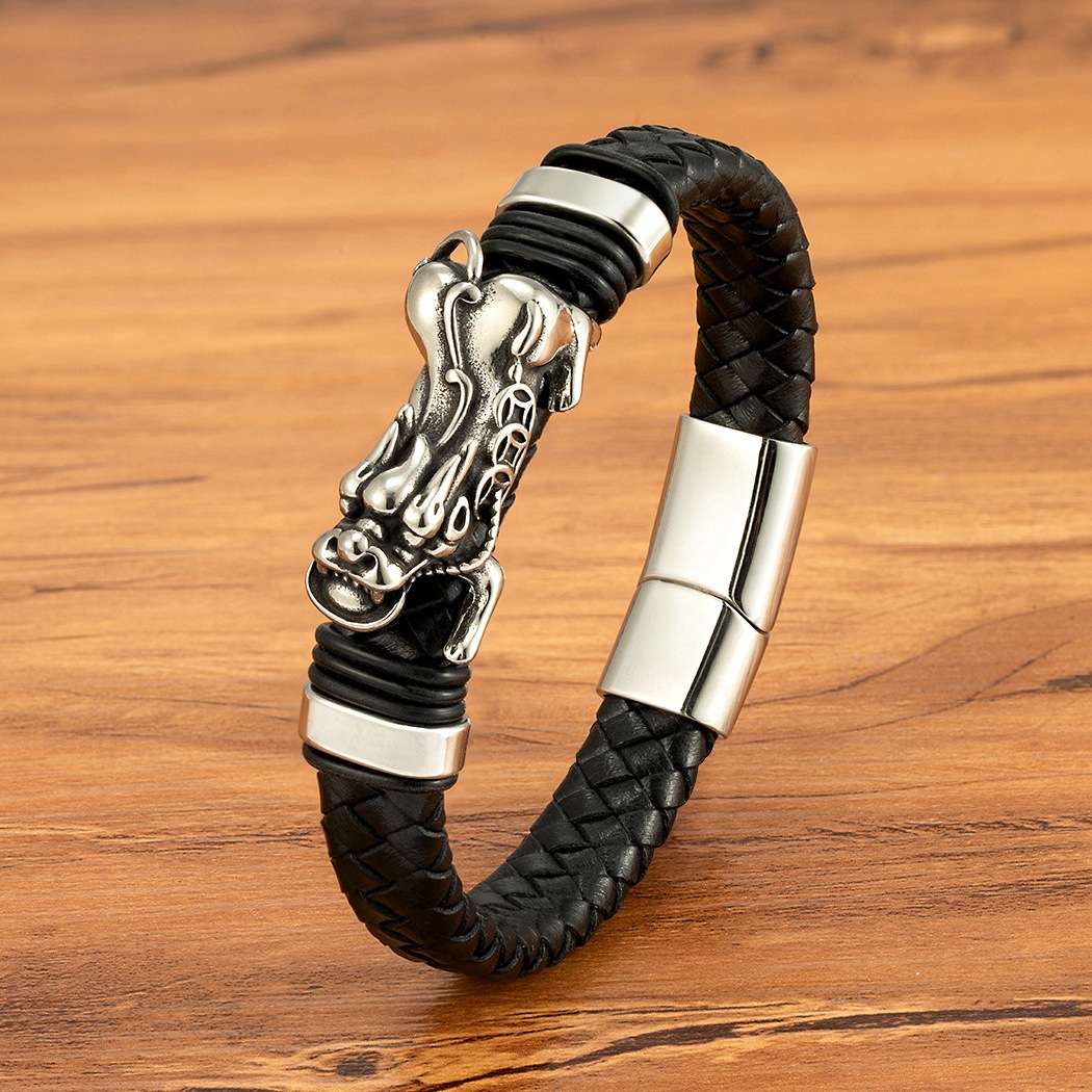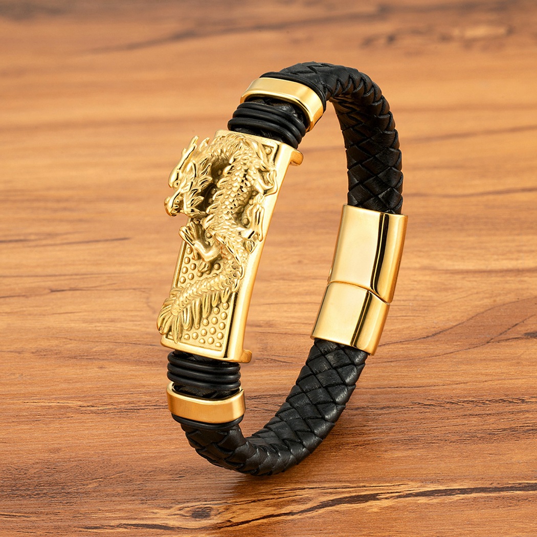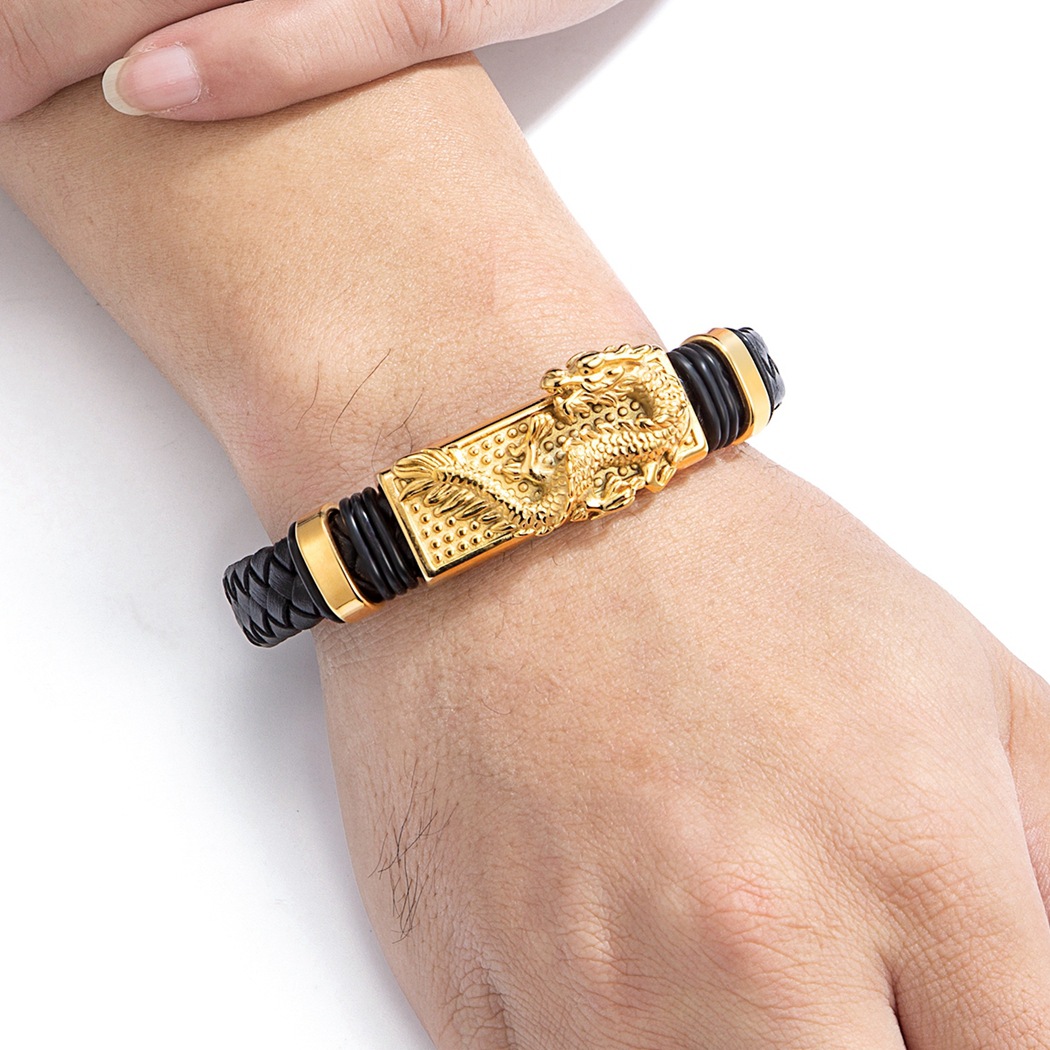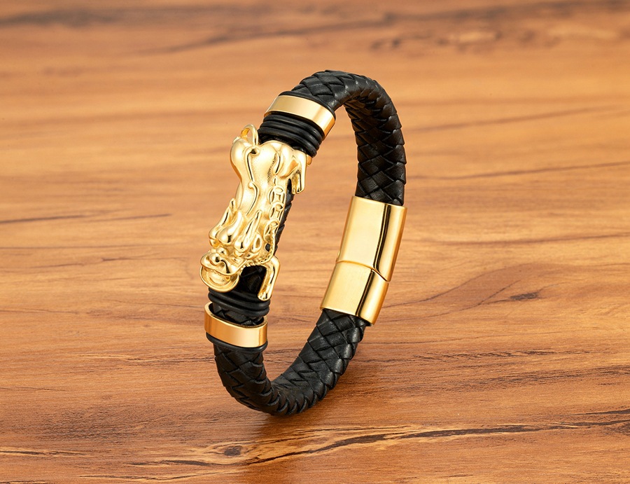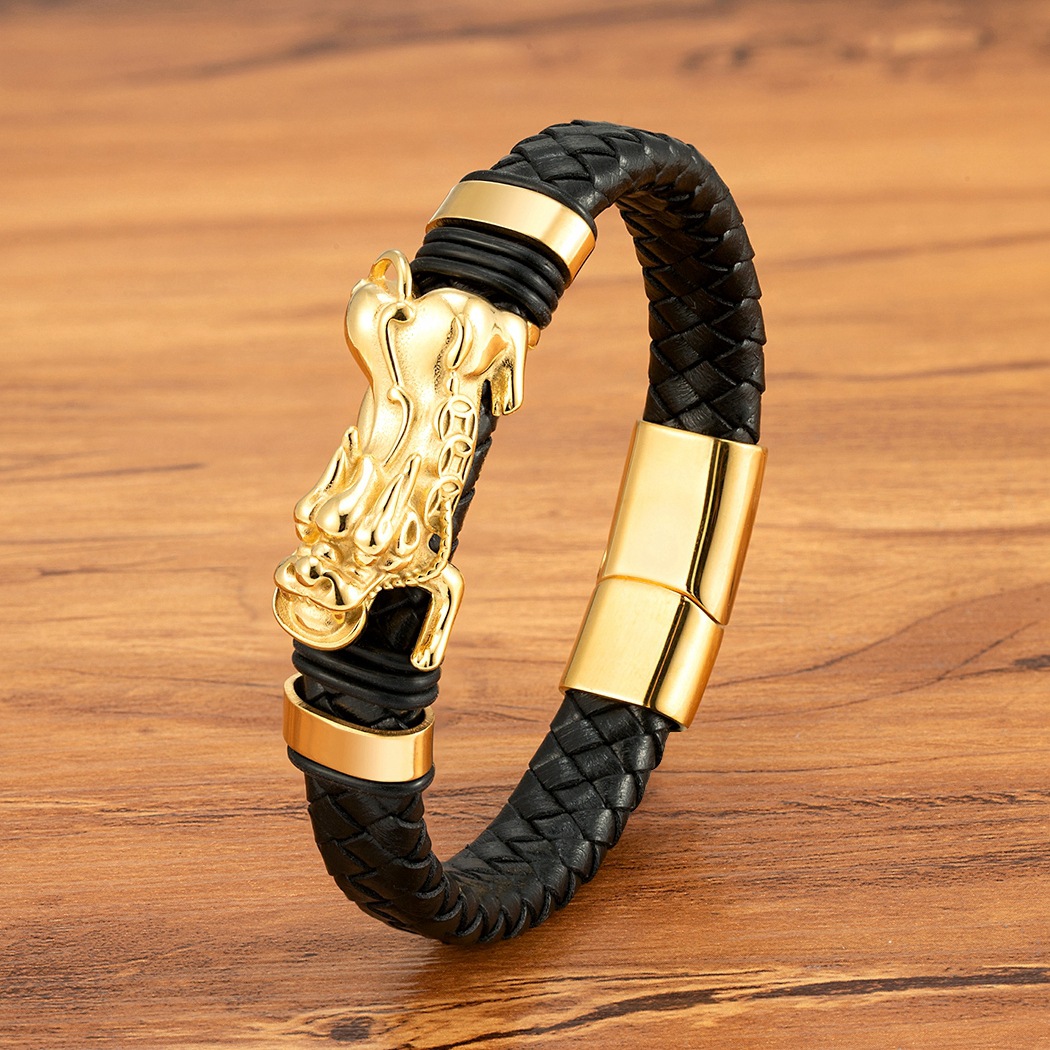 Gold And Steel-Colored Leopard-Pattern Dragon Pi Xiu Stainless Steel Leather Magnetic-Clasp Mens Bracelet