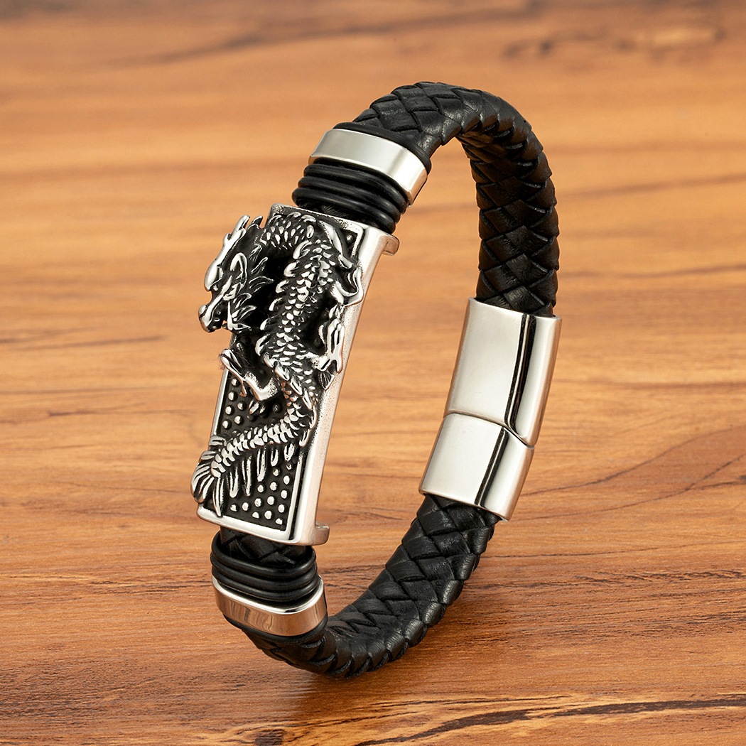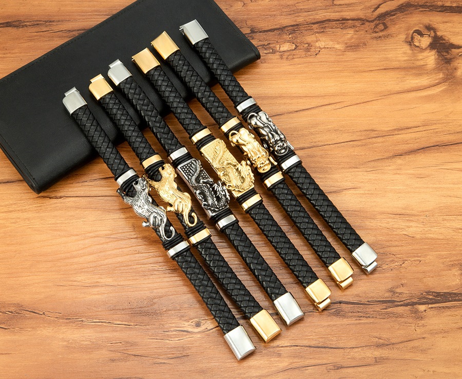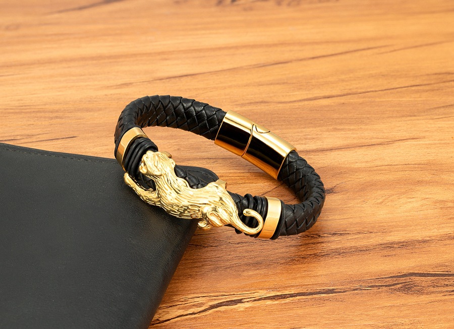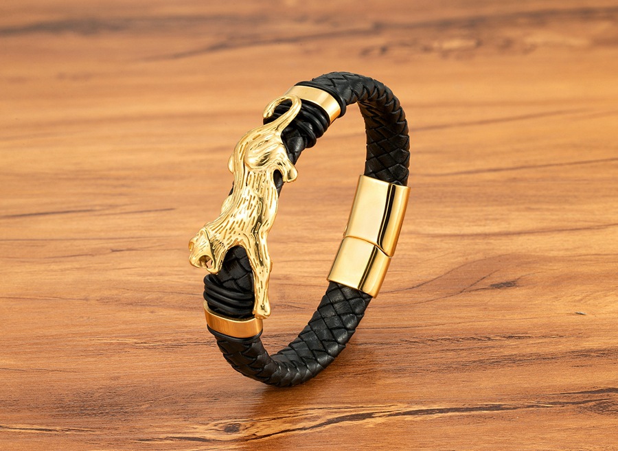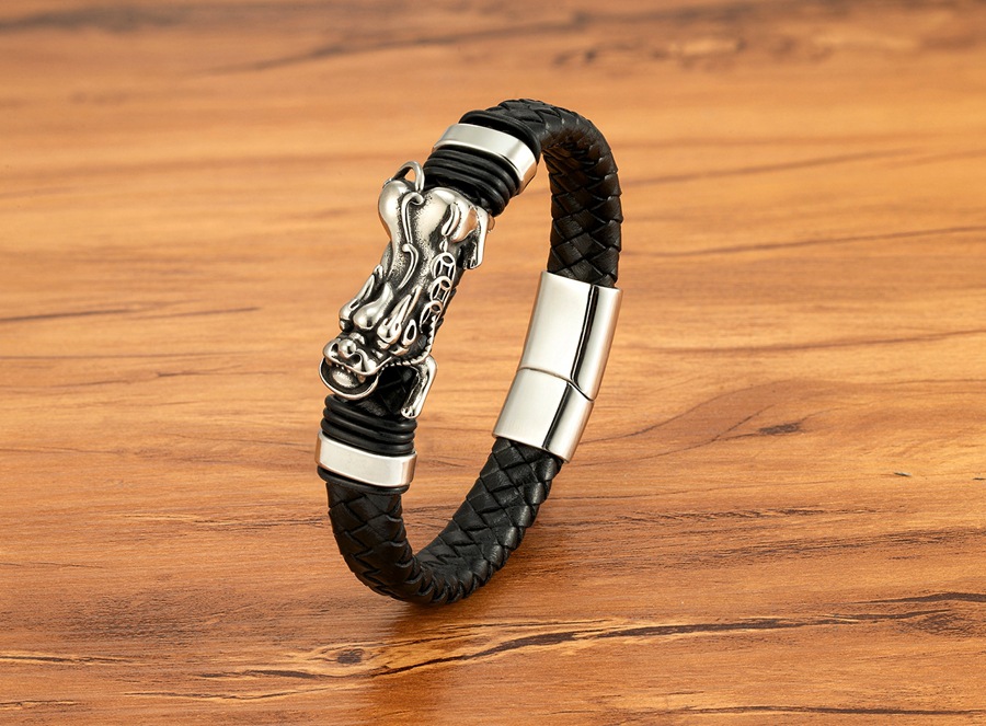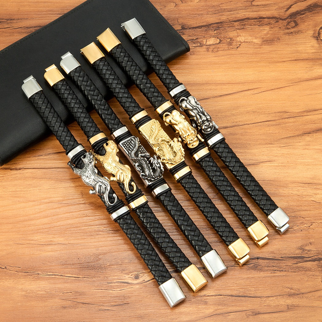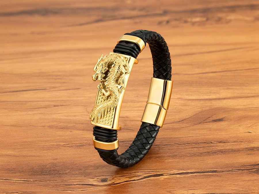 Gold And Steel-Colored Leopard-Pattern Dragon Pi Xiu Stainless Steel Leather Magnetic-Clasp Mens Bracelet
