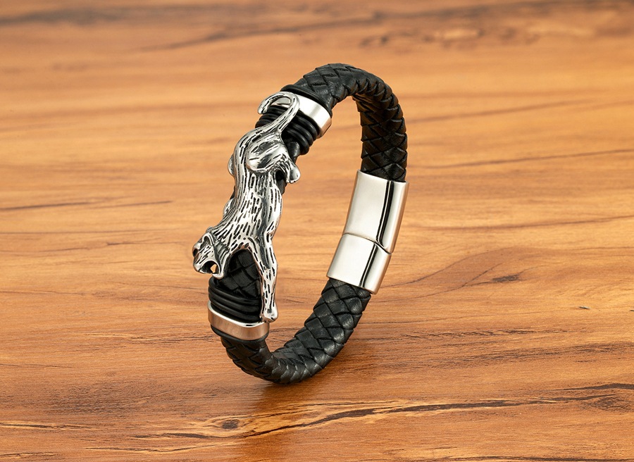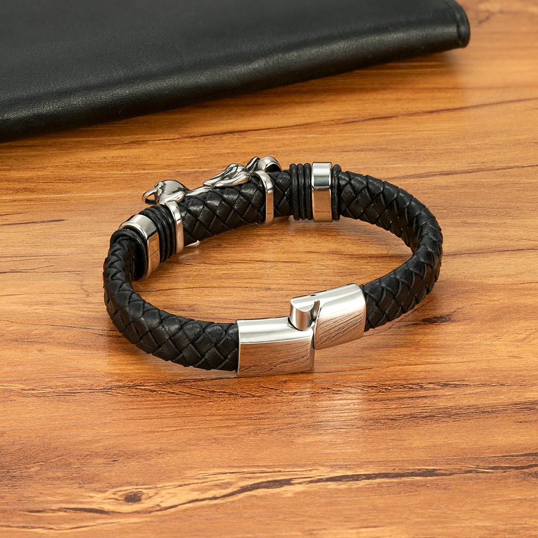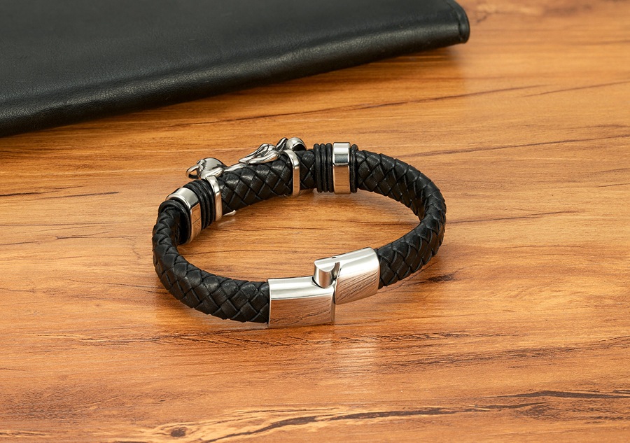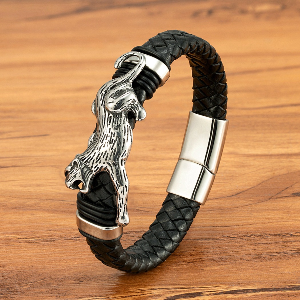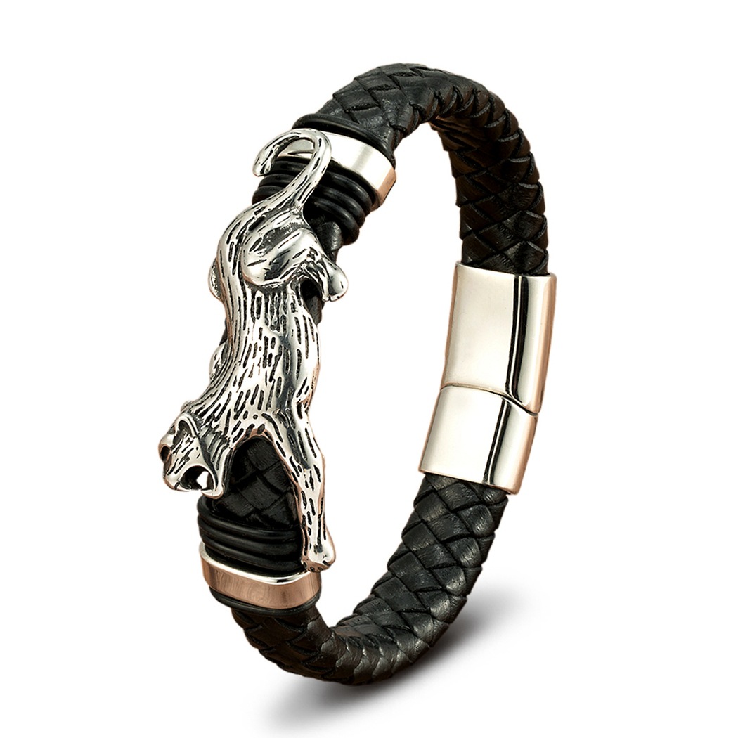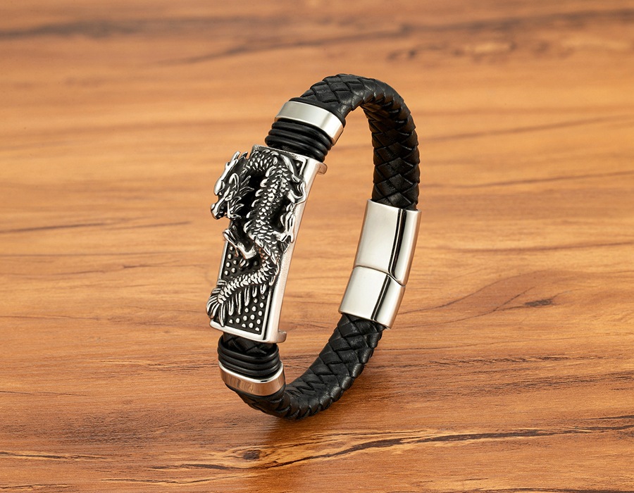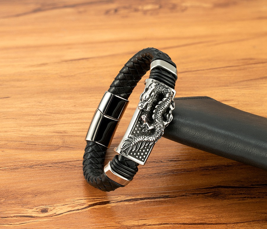 Gold And Steel-Colored Leopard-Pattern Dragon Pi Xiu Stainless Steel Leather Magnetic-Clasp Mens Bracelet