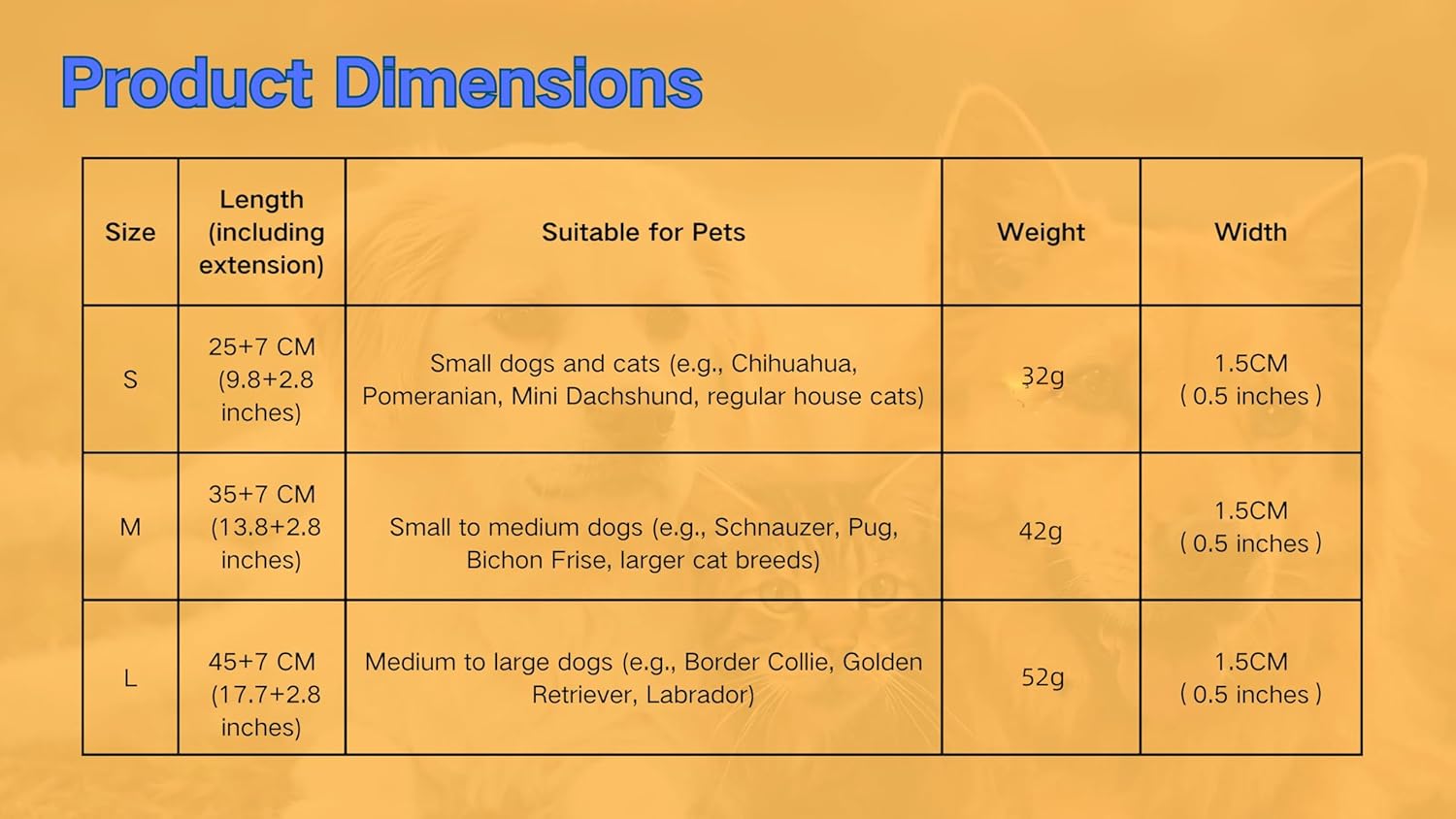 Length: S code 25 + 7CM extension chain, M code 35 + 7CM extension chain, L code 45 + 7CM extension chain, XL code 55 + 7CM extension chain