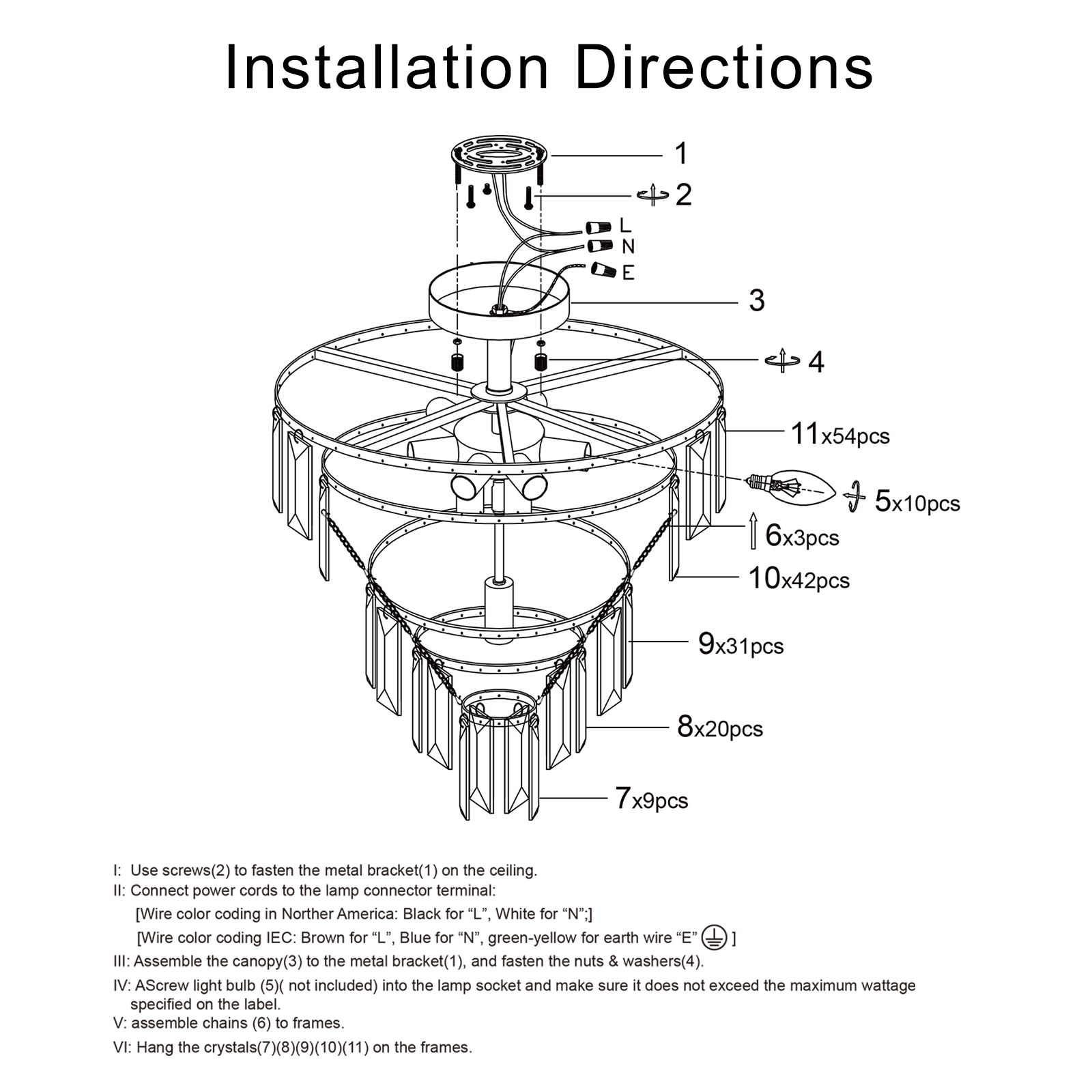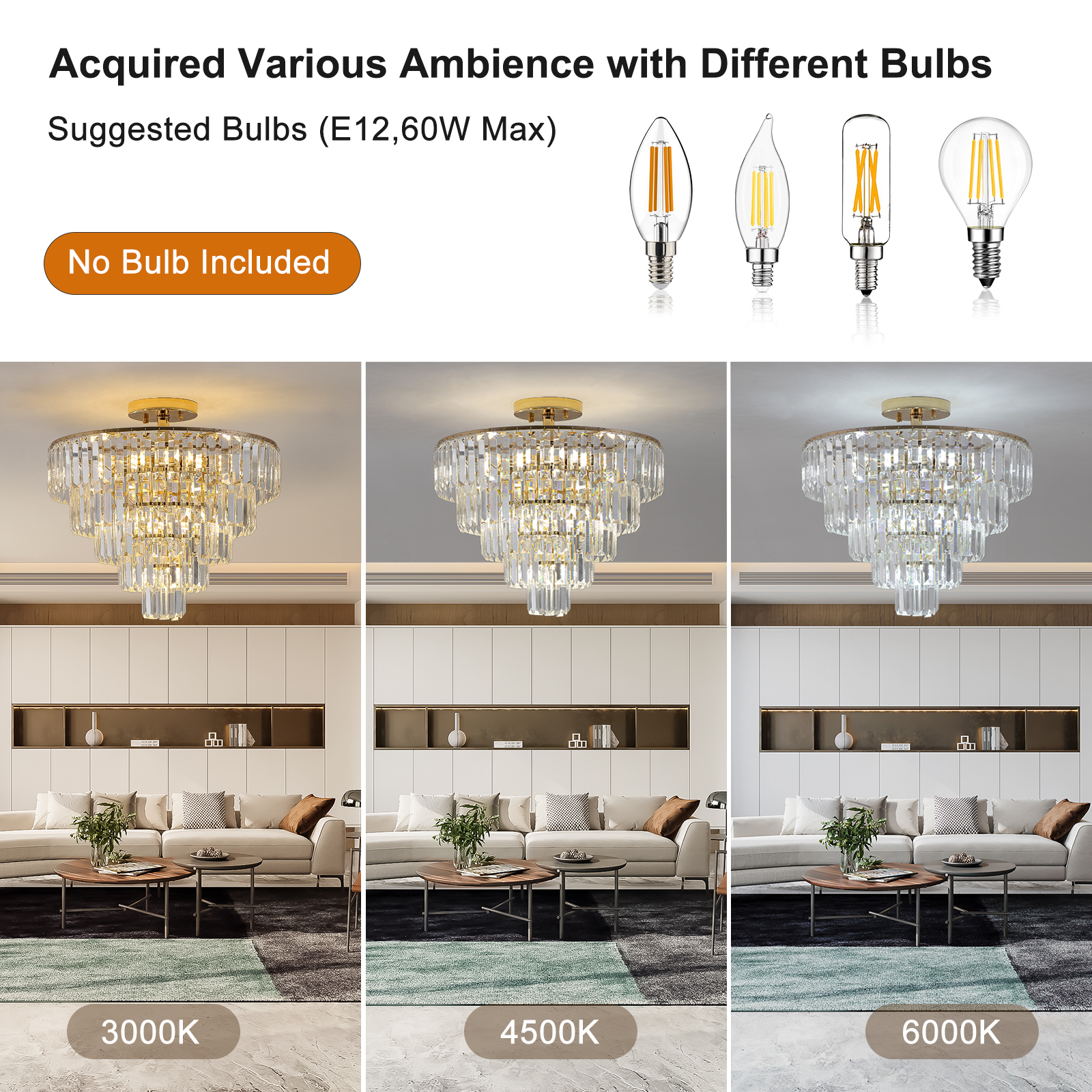 Elegant and classic design -The crystal chandelier comes with a high-quality metal frame and K9 top-notch crystal.Dimensions -19.3 inches high and 19.7 inches wide.Bulb requirements -Modern ceiling chandeliers use 10 x E12 bulbs, compatible with dimmable bulbs, energy-saving bulbs, LED bulbs, Halogen lamp, etc.(Excluding)Applicable scenarios -This ceiling light fixture could light up your room extremely and widely to create a superior and classy atmosphere in your living room, dining room and bedroom,etc.
