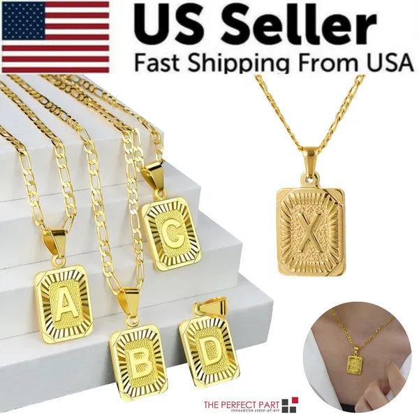 Gold Plated Initial Letter Pendant Necklace Stainless Steel Figaro Chain