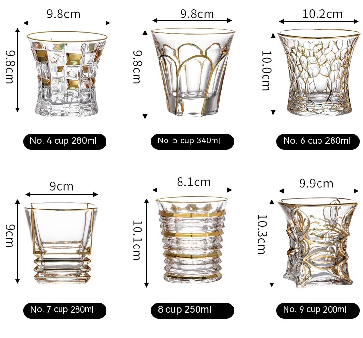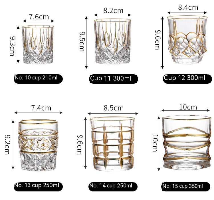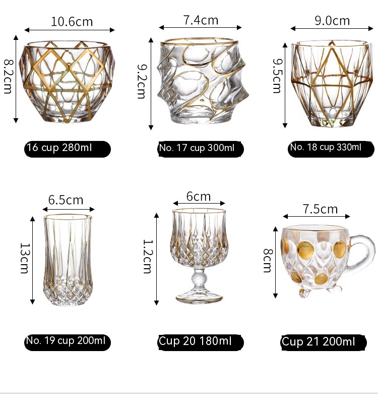 Specification size: Gold 1 cup/210ml, Gold 2 cup/300ml, Gold 3 Cup/280ml, Gold 4 Cup/280ml, gold 5 Cup/340ml, gold 6 Cup/280ml, gold painting Cup No. 7/280ml, gold painting Cup No. 8/250ml, gold painting Cup No. 9/200ml, gold painting Cup No. 10/280ml, gold painting Cup No. 12/300ml, gold painting Cup No. 13/250ml, gold painting Cup No. 14/250ml, gold painting Cup No. 15/350ml, gold painting Cup No. 16/280ml, gold painting Cup No. 17/300ml, gold 18 Cup/330ml, gold 20 Cup/180ml, Gold 11 Cup/280ml